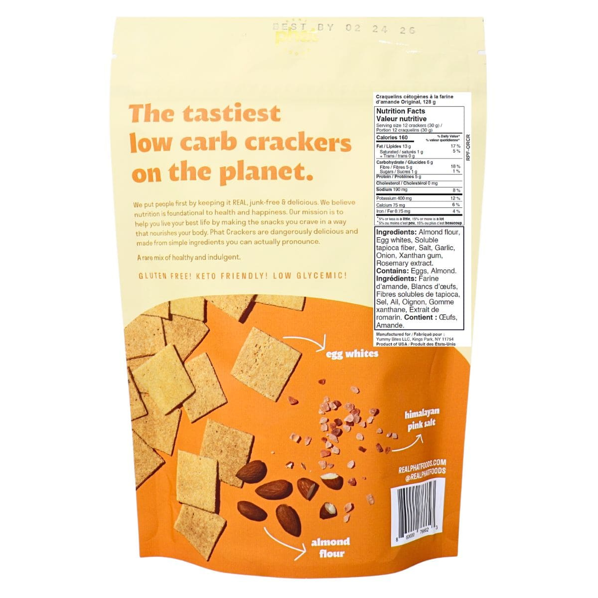 That's what Real Phat Foods are all about — delicious, crave-worthy snacking made with simple, clean ingredients. Perfectly seasoned with onion, garlic, and Himalayan pink salt, every bite of this almond flour cracker is just the right mix of crunchy and salty, so you can enjoy your favourite spreads and toppings, or just enjoy it on its own. And because they're made with almond flour and egg whites, they're paleo-friendly, keto-friendly, gluten-free…and only have one net carb per serving! Packed with flavour and crunchy goodness—you'll be reaching for more again and again!