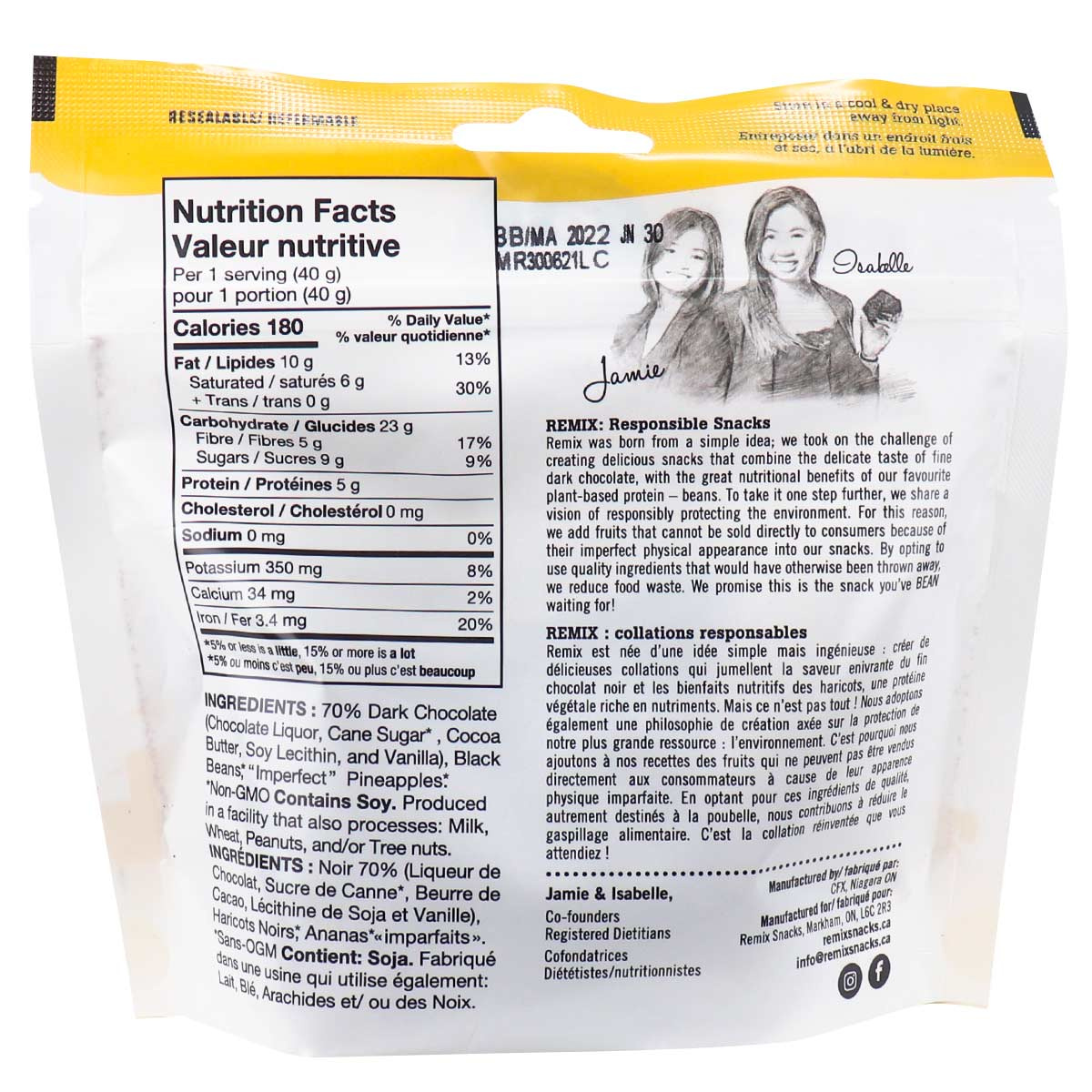 Your snack pantry isn’t complete without Remix Snacks Bean Bark 70% Dark Chocolate Bark Pineapple. The perfect balance of tart dark chocolate and fruity pineapple chunks. This bark is vegan-friendly and contains 12g of both fibre and protein. Canadian-made and the ideal snack to share with those around you. Enjoy on its own or paired with a smoothie or yogurt bowl for maximum deliciousness. Don’t have time to sit down for your snack break? No problem! This bark comes in a convenient package that makes snacking on-the-go, simple. Unlock exceptional taste with Remix Snacks.