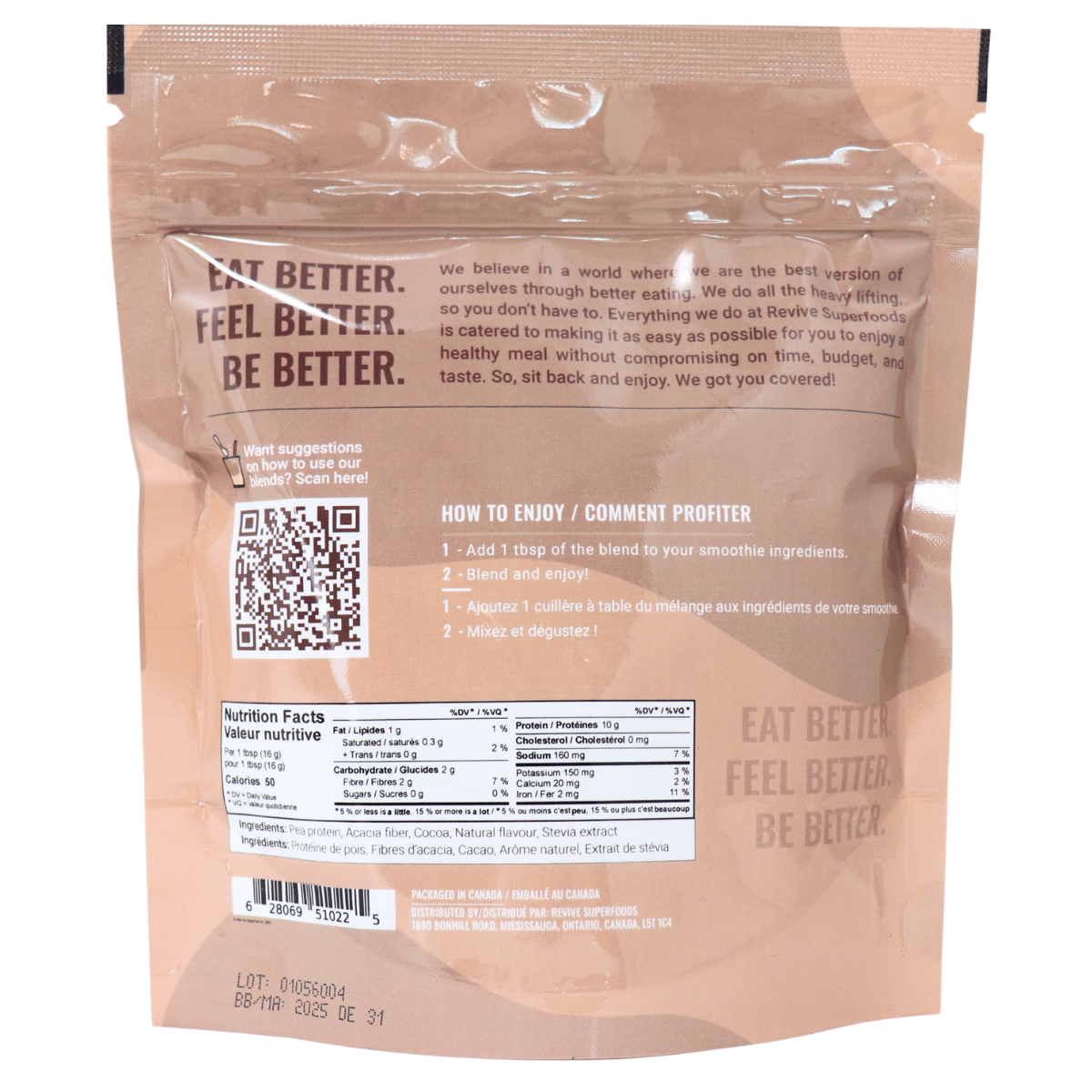 Revive Superfoods is ready to bring you plant-based protein without the extras. This chocolate protein powder blend offers a delicious way to add clean, quality plant-based protein and fibre to your routine while keeping things allergen friendly, with only 5 simple ingredients. Pea protein is a gentle, allergen-friendly source of plant protein that helps keep you full and energized, while acacia fiber supports digestion and gut health in one go. And with real cocoa to add that chocolatey indulgence, you can make your daily protein fix feel like a treat.
