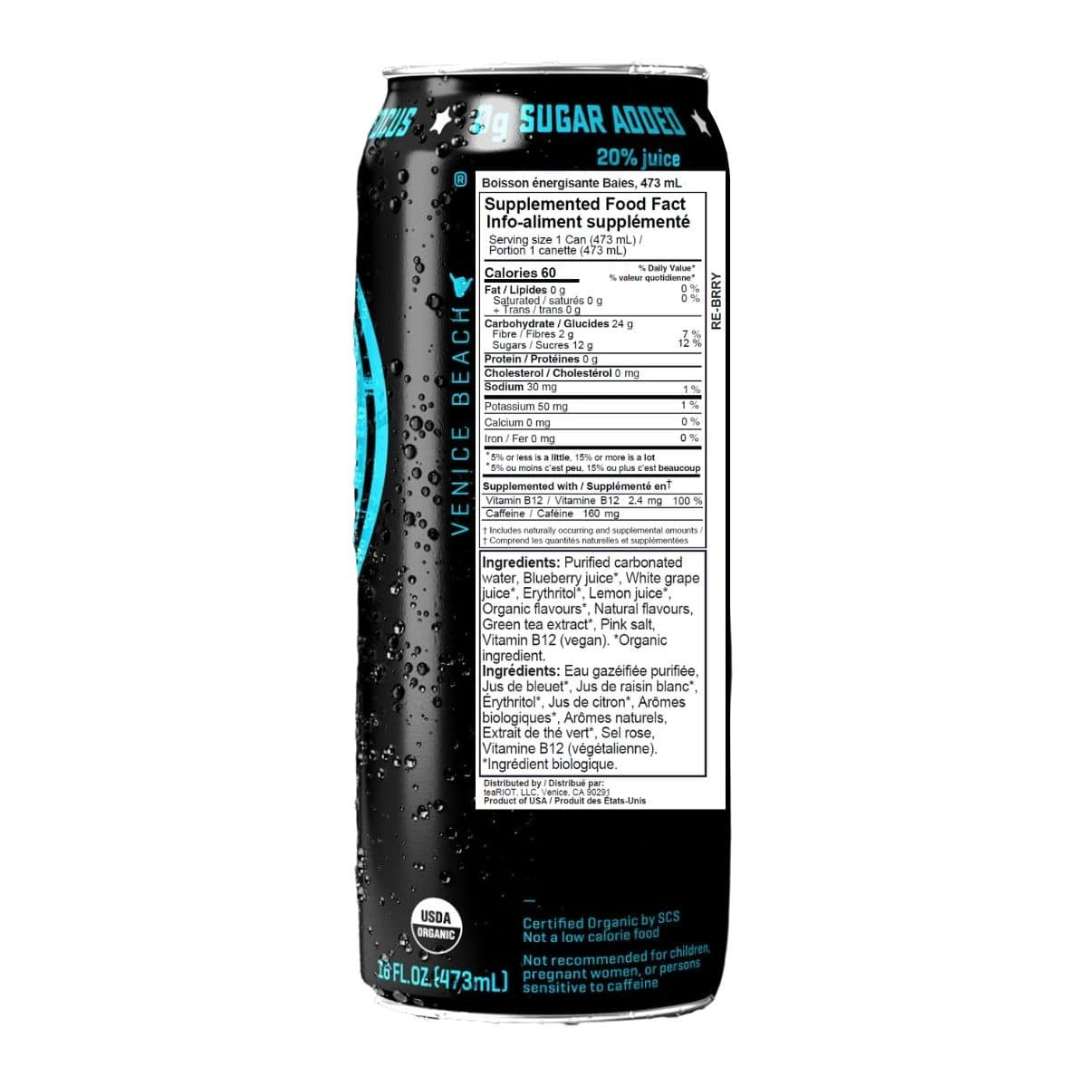 Purified carbonated water, Blueberry juice*, White grape juice*, Erythritol*, Lemon juice*, Organic flavours*, Natural flavours, Green tea extract*, Pink salt, Vitamin B12 (vegan).