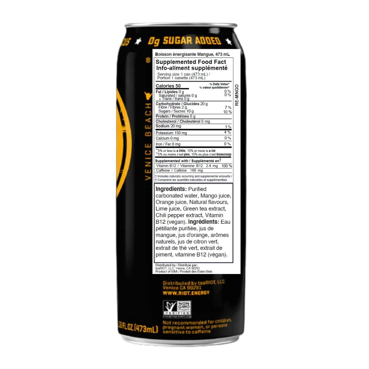 Purified carbonated water, Mango juice, Orange juice, Natural flavours, Lime juice, Green tea extract, Chili pepper extract, Vitamin B12 (vegan).
