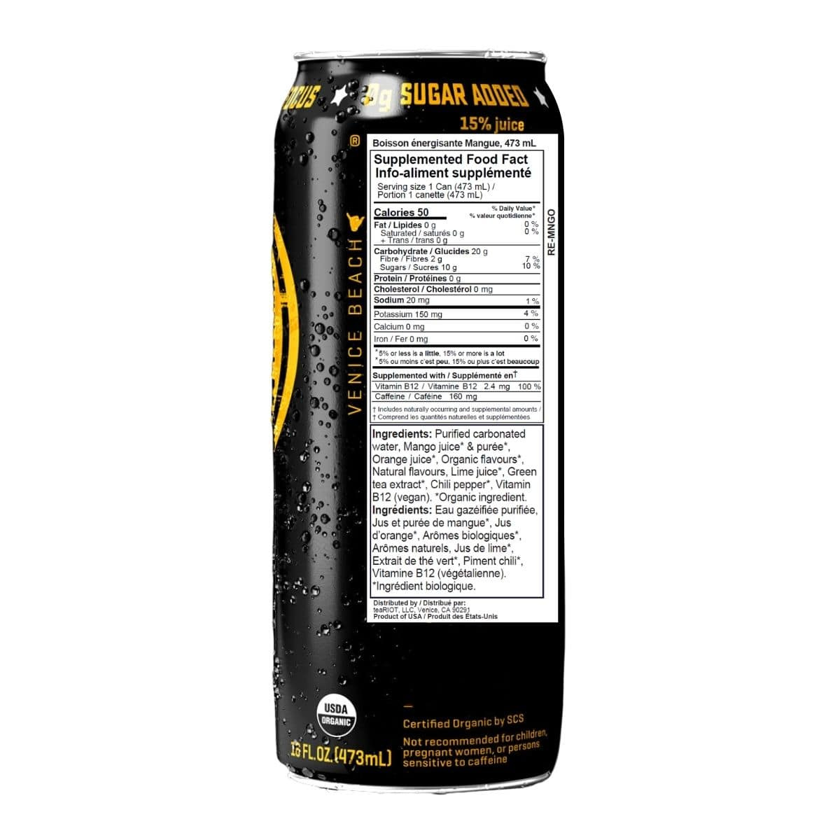 Purified carbonated water, Mango juice* & purée*, Orange juice*, Organic flavours*, Natural flavours, Lime juice*, Green tea extract*, Chili pepper*, Vitamin B12 (vegan).