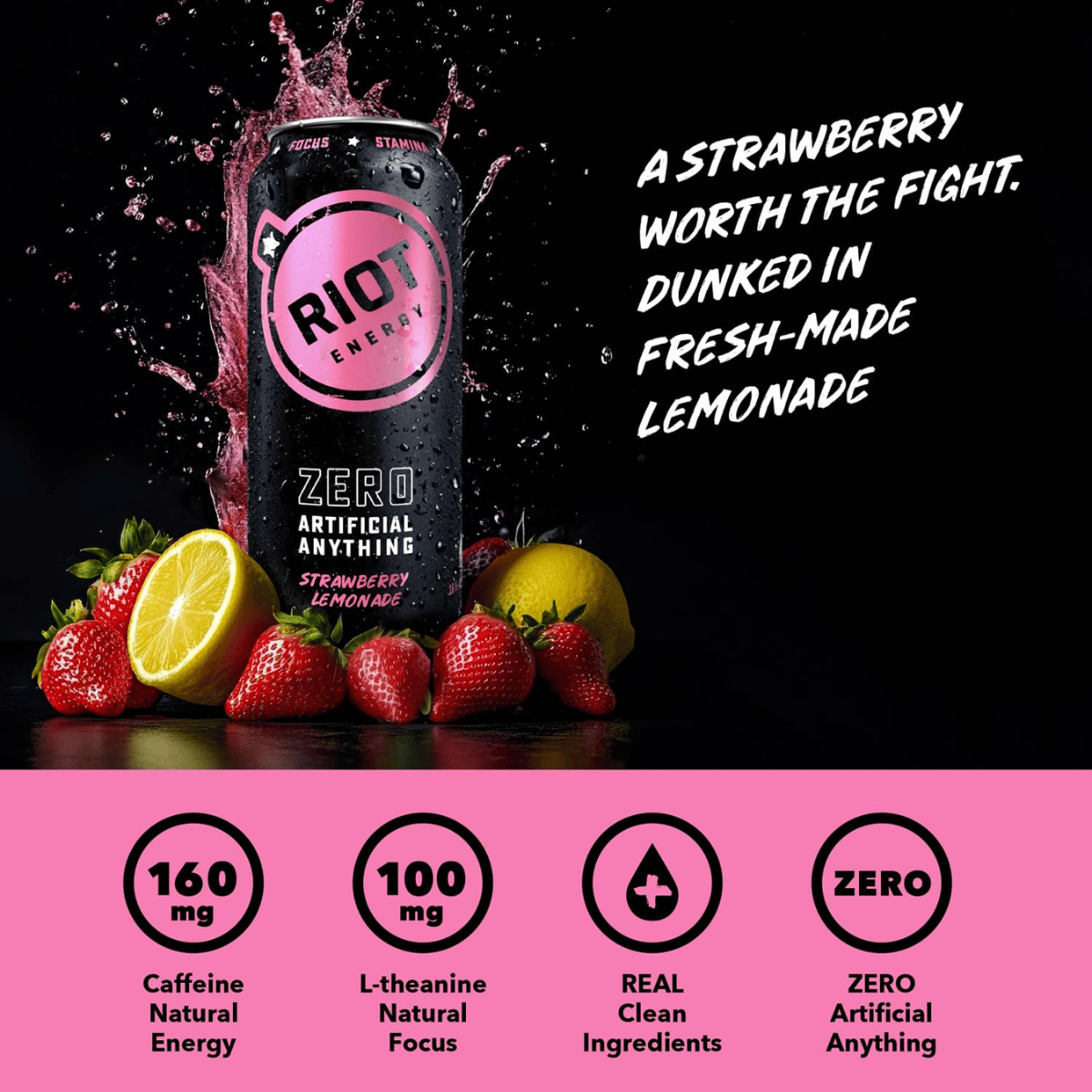 Made without refined sugar or artificial sweeteners, RIOT Energy Strawberry Lemonade proves that clean, plant-based energy can be craveable too. It’s a real-juice energy drink that refreshes while it powers you up.