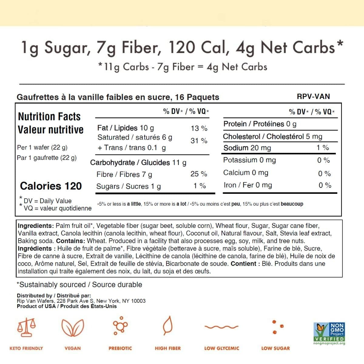 Rip Van's low-carb vanilla wafers have less sugar, more fibre, and fewer calories. Two generous layers of delicate vanilla filling between three layers of light and crispy wafer, these heavenly vegan wafers contain just 4g of carbs, making them the perfect keto snack! Each layer is light and crispy, with 7g of fibre and just 1g of sugar per cookie. It’s the perfect balance of rich flavour and perfectly light texture for a heavenly bite every time!