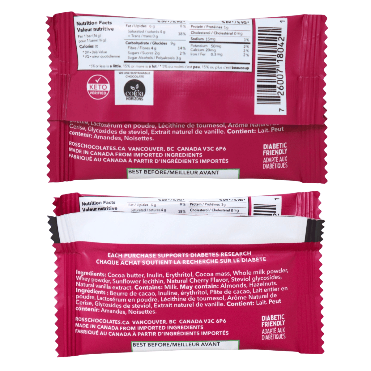 Ross Chocolates Whispers Milk Chocolate with Cherry, 16g – Cocoa butter, Inulin, Erythritol, Cocoa mass, Whole milk powder, Whey powder, Sunflower lecithin, Natural cherry flavor, Steviol glycosides, Natural vanilla extract.Â