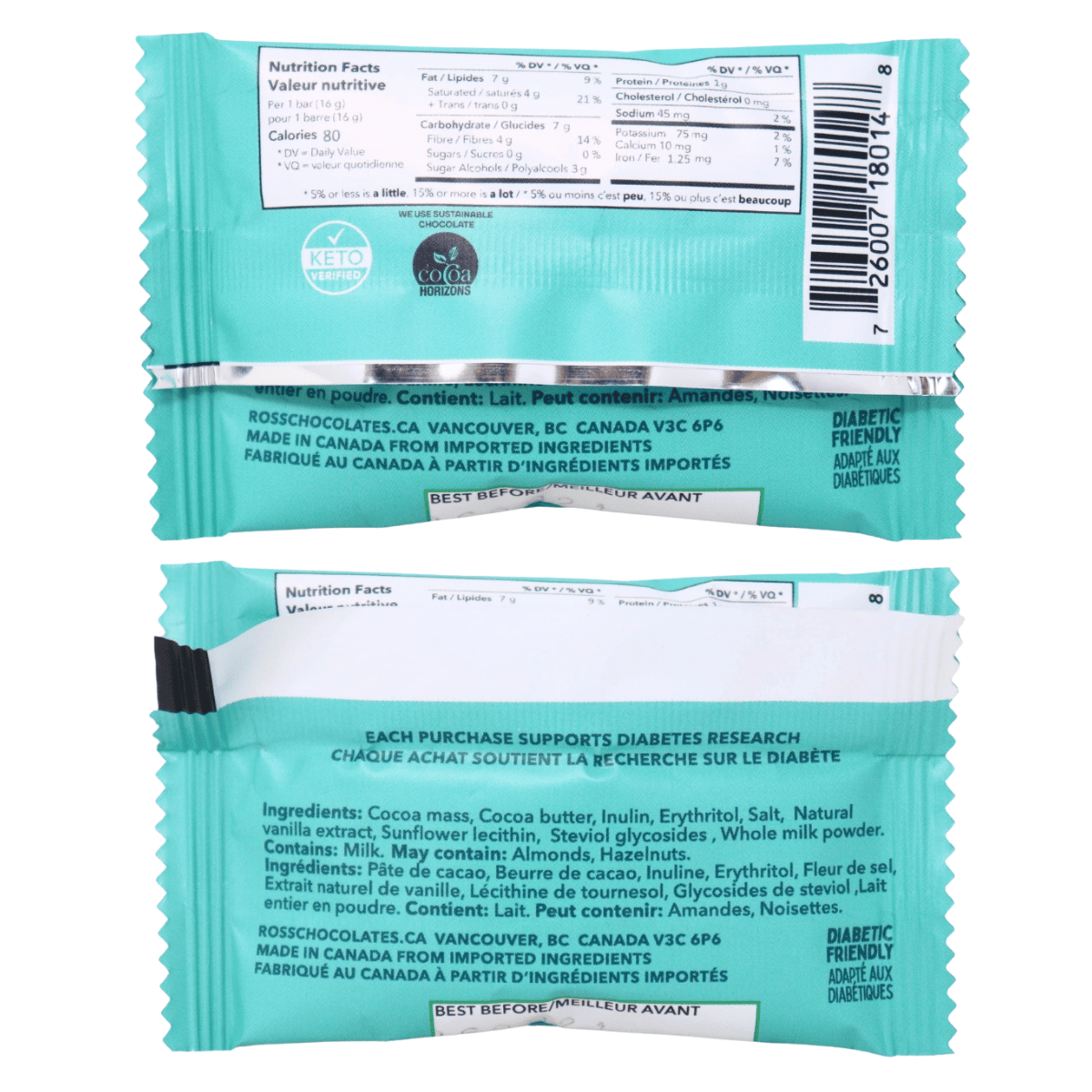 Ross Chocolates Whispers Dark Chocolate with Sea Salt, 16g – Cocoa mass, Cocoa butter, Inulin, Erythritol, Salt, Natural vanilla extract, Sunflower lecithin, Steviol glycosides, Whole milk powder.