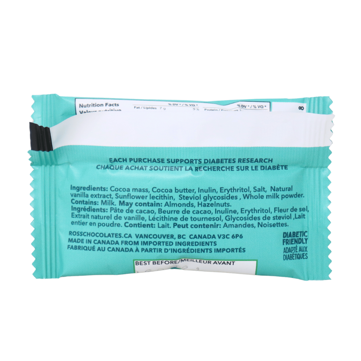 Cocoa mass, Cocoa butter, Inulin, Erythritol, Salt, Natural vanilla extract, Sunflower lecithin, Steviol glycosides, Whole milk powder.