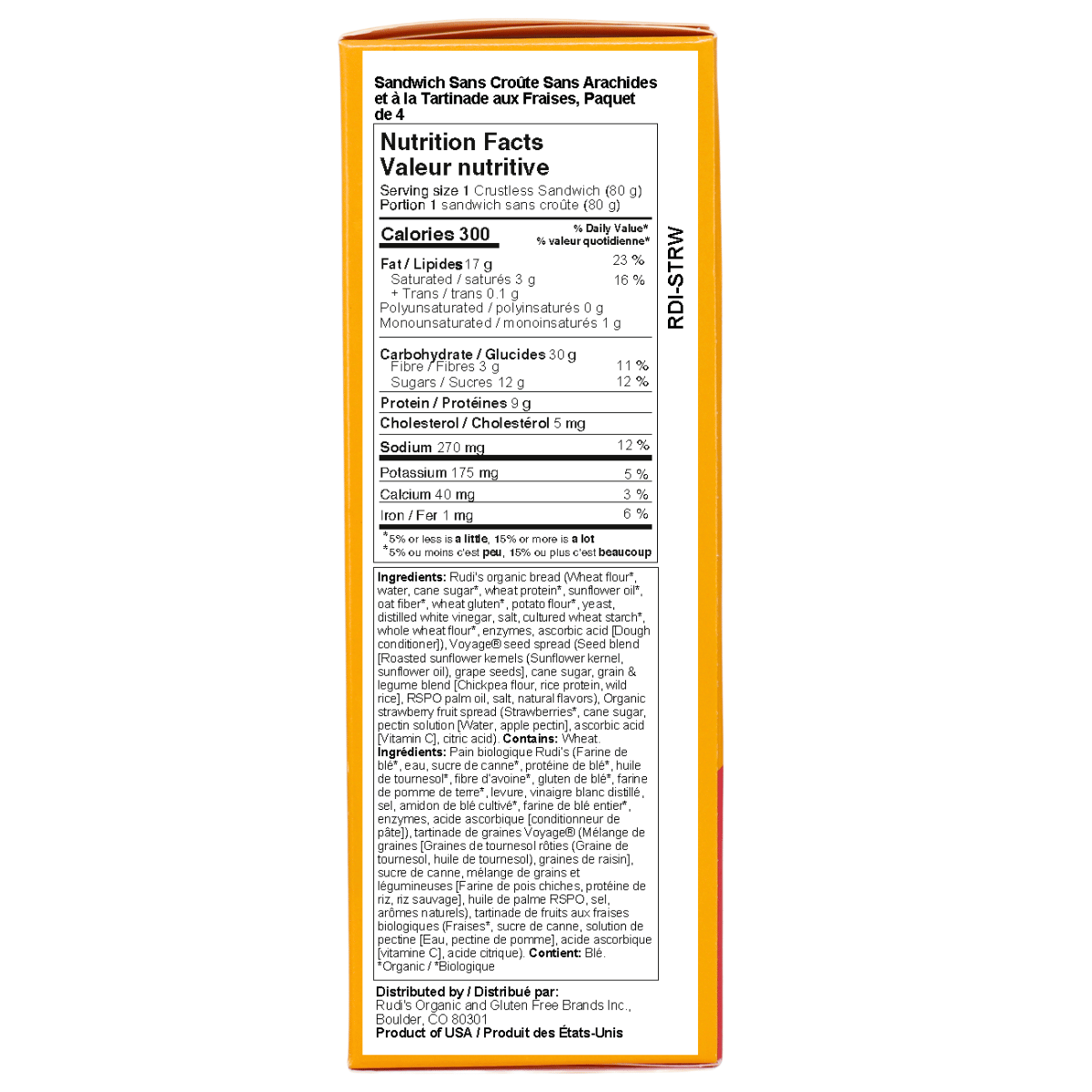 Rudi's organic bread (Wheat flour*, water, cane sugar*, wheat protein*, sunflower oil*, oat fiber*, wheat gluten*, potato flour*, yeast, distilled white vinegar, salt, cultured wheat starch*, whole wheat flour*, enzymes, ascorbic acid [Dough conditioner]), Voyage® seed spread (Seed blend [Roasted sunflower kernels (Sunflower kernel, sunflower oil), grape seeds], cane sugar, grain & legume blend [Chickpea flour, rice protein, wild rice], RSPO palm oil, salt, natural flavors), Organic strawberry fruit spread (Strawberries*, cane sugar, pectin solution [Water, apple pectin], ascorbic acid [Vitamin C], citric acid).