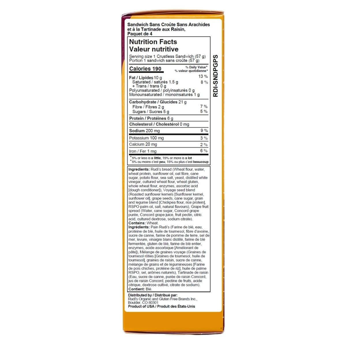 Rudi’s bread (Wheat flour, water, wheat protein, sunflower oil, oat fibre, cane sugar, potato flour, sea salt, yeast, distilled white vinegar, cultured wheat flour, wheat gluten, whole wheat flour, enzymes, ascorbic acid [dough conditioner]), Voyage seed blend (Roasted sunflower kernels [Sunflower kernel, sunflower oil], grape seeds, cane sugar, grain and legume blend [Chickpea flour, rice protein], RSPO palm oil, salt, natural flavours), Grape fruit spread (Water, cane sugar, Concord grape purée, Concord grape juice, fruit pectin, citric acid, cultured dextrose, sodium citrate).