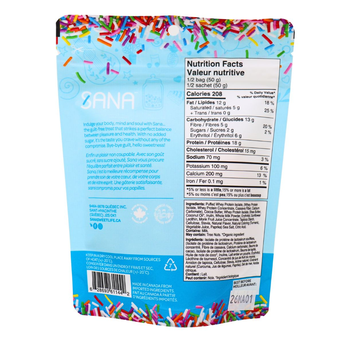Get ready for a party in your mouth. With Sana Sweet Life's birthday cake chocolate protein bites, every day is a celebration. Who needs a reason to celebrate anyway, when you can indulge guilt-free with this pack of joy? Coated in dreamy, creamy white chocolate and bursting with the flavour of birthday cake. These protein bites are a confetti explosion of happiness! Each serving is packed with 18g of protein. So flex those muscles while you indulge. No gym selfies needed! No added sugar in these gluten free protein balls. Keto-friendly and downright delicious too!Â