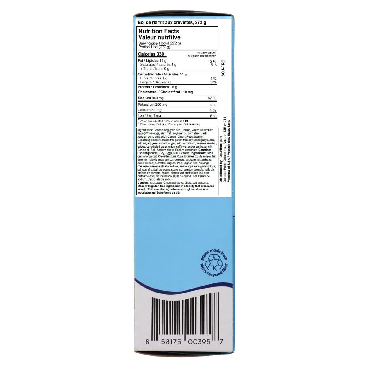 Cooked long grain rice, Shrimp, Water, Scrambled eggs (Whole eggs, skim milk, soybean oil, corn starch, salt, xanthan gum, citric acid), Carrots, Onion, Peas, Scallion, Seasoning blend (Maltodextrin, gluten-free soy sauce [Soybeans, salt, sugar], yeast extract, sugar, salt, corn starch, sesame seed oil, spices, dehydrated green onion, safflower and/or sunflower oil), Canola oil, Salt, Sodium citrate, Sodium carbonate.