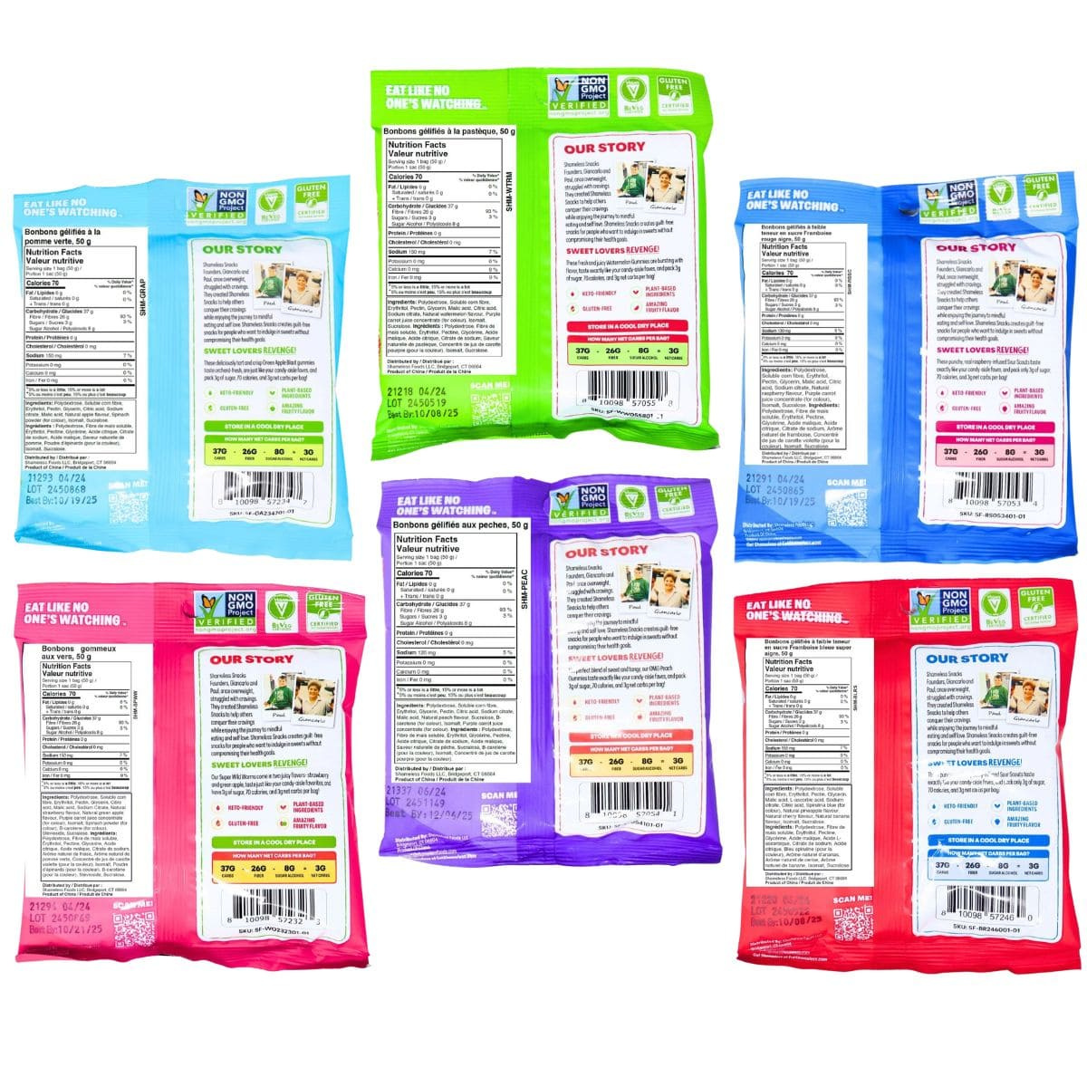 OMG Peach - Polydextrose, Soluble corn fibre, Erythritol, Glycerin, Pectin, Citric acid, Sodium citrate, Malic acid, Natural peach flavour, Sucralose, B-carotene (for colour), Isomalt, Purple carrot juice concentrate (for colour)