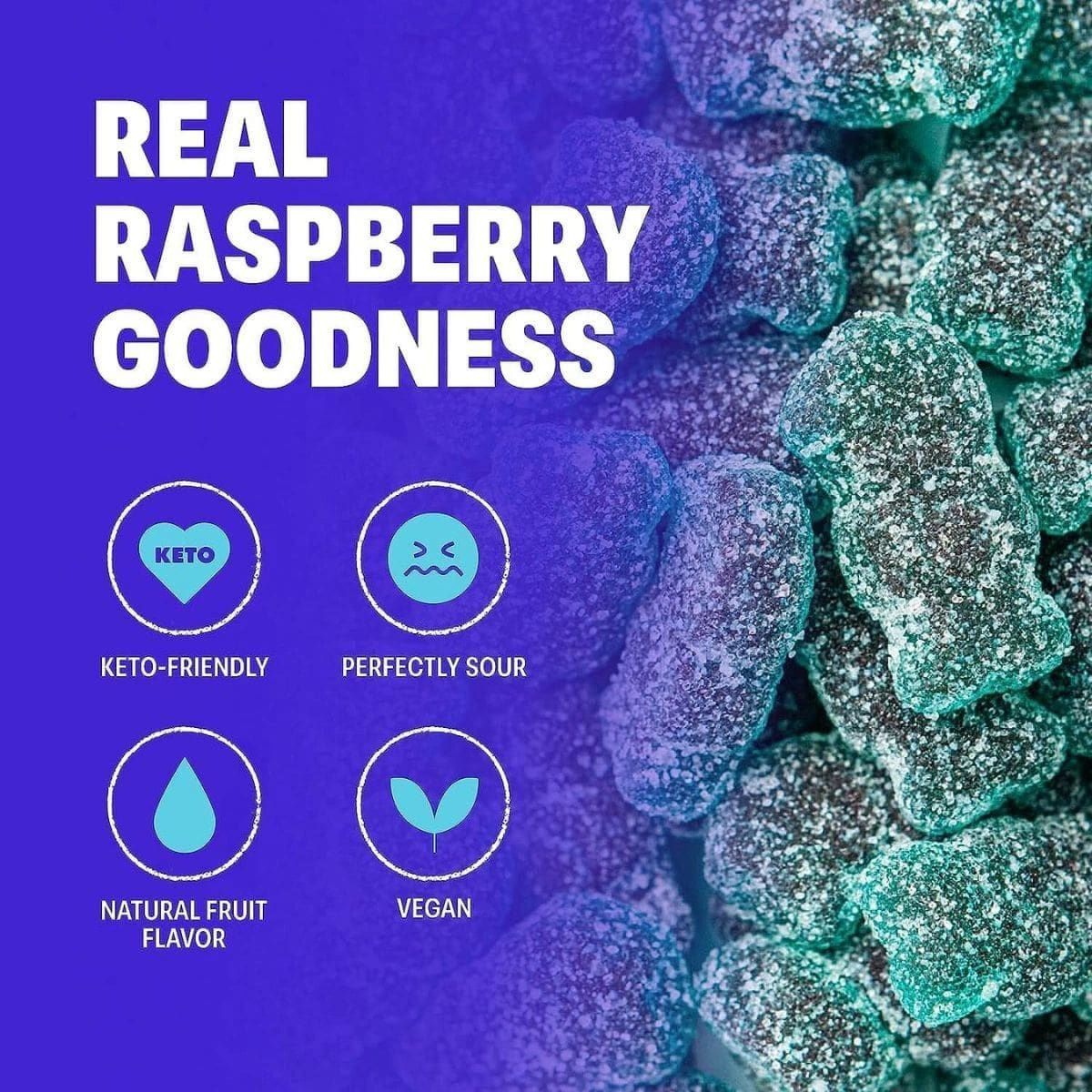 Sour Blue Raspberry - Polydextrose, Soluble corn fibre, Erythritol, Pectin, Glycerin, Malic acid, Citric acid, Sodium citrate, Natural banana flavour, Natural pineapple flavour, Natural cherry flavour, Isomalt, Blue 1, Sucralose
