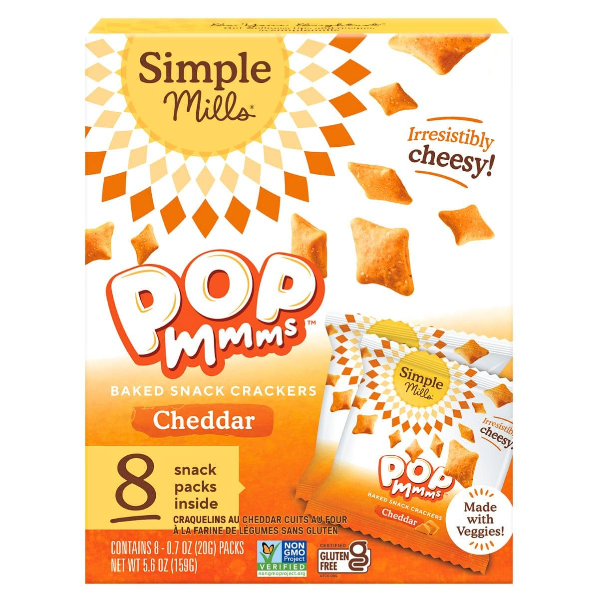 Cheesy, crunchy FUN! Simple Mills Cheddar Pop Mmms Baked Snack Crackers are the ideal snack for when you have a craving that only a cheesy cracker crunch will satisfy. These airy, bite-sized crackers are great for a grab and-and-go munchy crunchy treat.