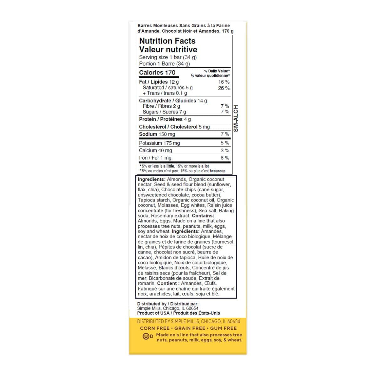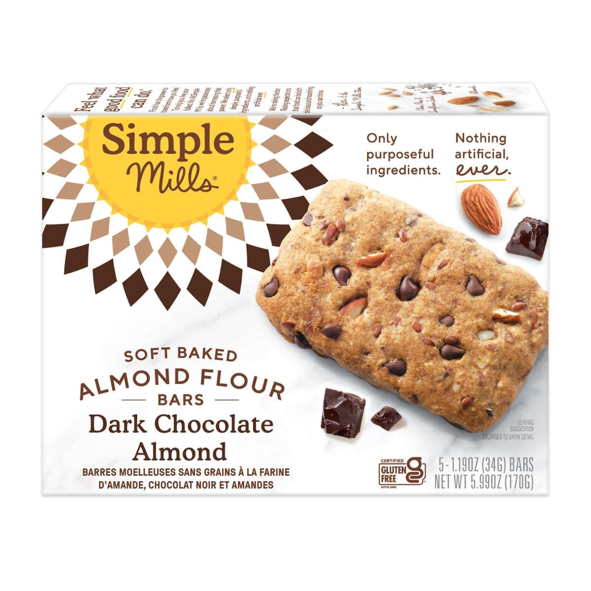 Simple Mills Grain-Free Soft Baked Almond Flour Bars Dark Chocolate Almond, 5 Bars