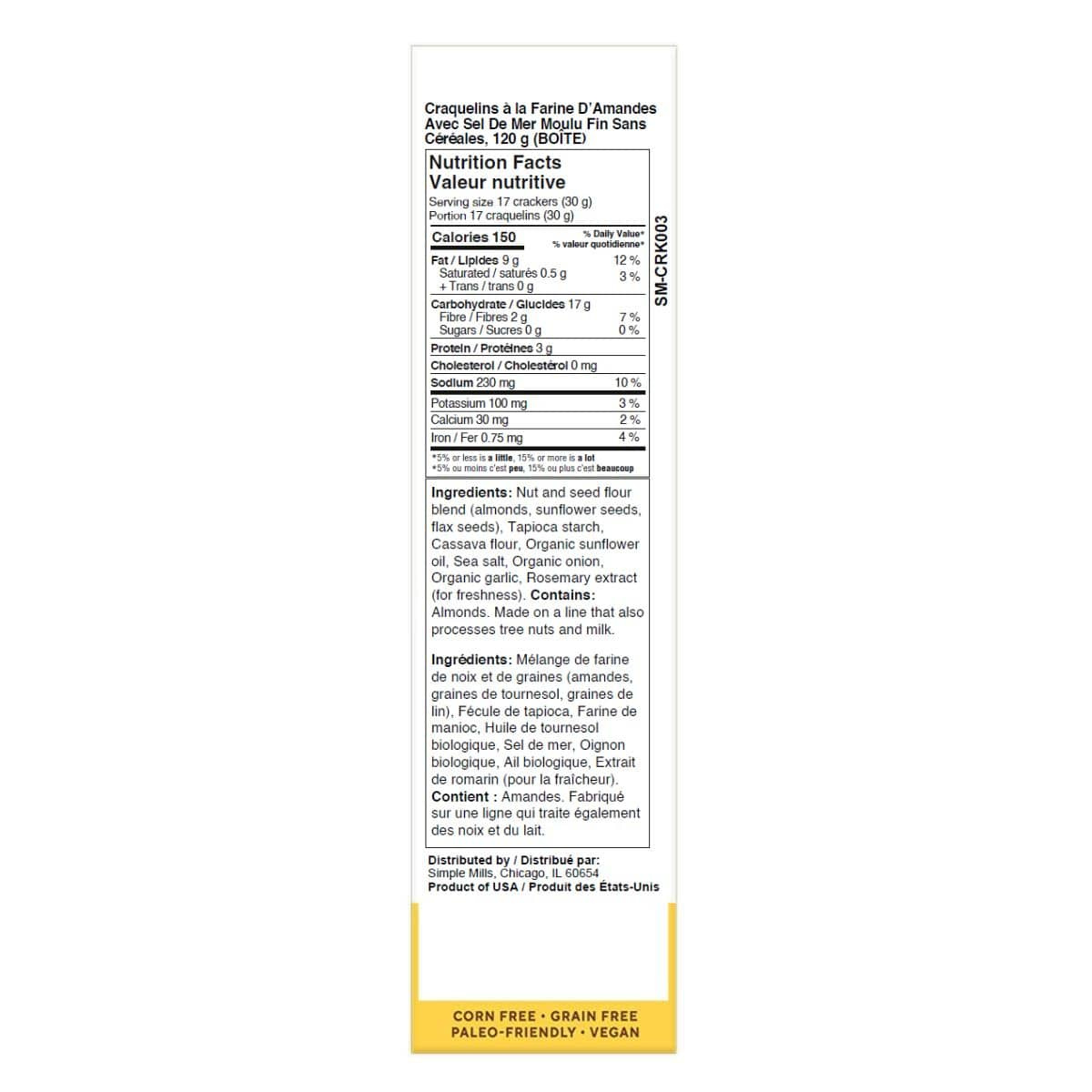 Nut and Seed Flour Blend (Almonds, Sunflower Seeds, Flax Seeds), Tapioca Starch, Cassava Flour, Organic Sunflower Oil, Sea Salt, Organic Onion, Organic Garlic, Rosemary Extract (For Freshness).