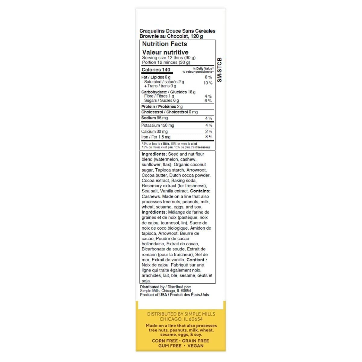 Seed and Nut Flour Blend (Watermelon, Cashew, Sunflower, Flax), Coconut Sugar, Tapioca Starch, Arrowroot, Cocoa Butter, Dutch Cocoa Powder, Cocoa Extract, Baking Soda, Rosemary Extract (For Freshness), Sea Salt, Vanilla Extract.