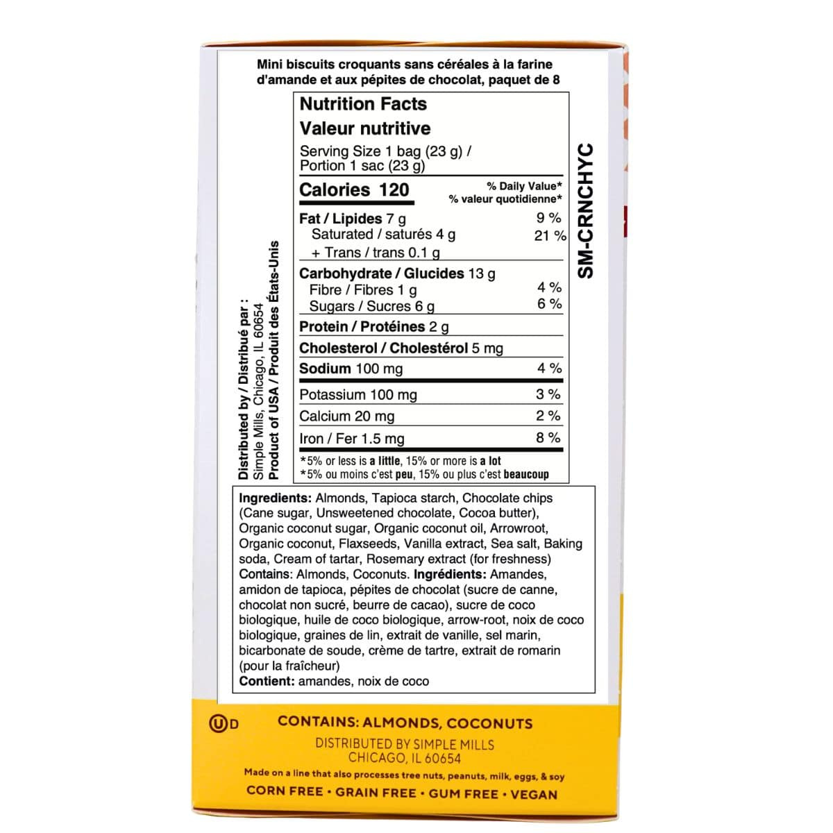 Almonds, Tapioca starch, Chocolate chips (Cane sugar, Unsweetened chocolate, Cocoa butter), Organic coconut sugar, Organic coconut oil, Arrowroot, Organic coconut, Flaxseeds, Vanilla extract, Sea salt, Baking soda, Cream of tartar, Rosemary extract (for freshness)