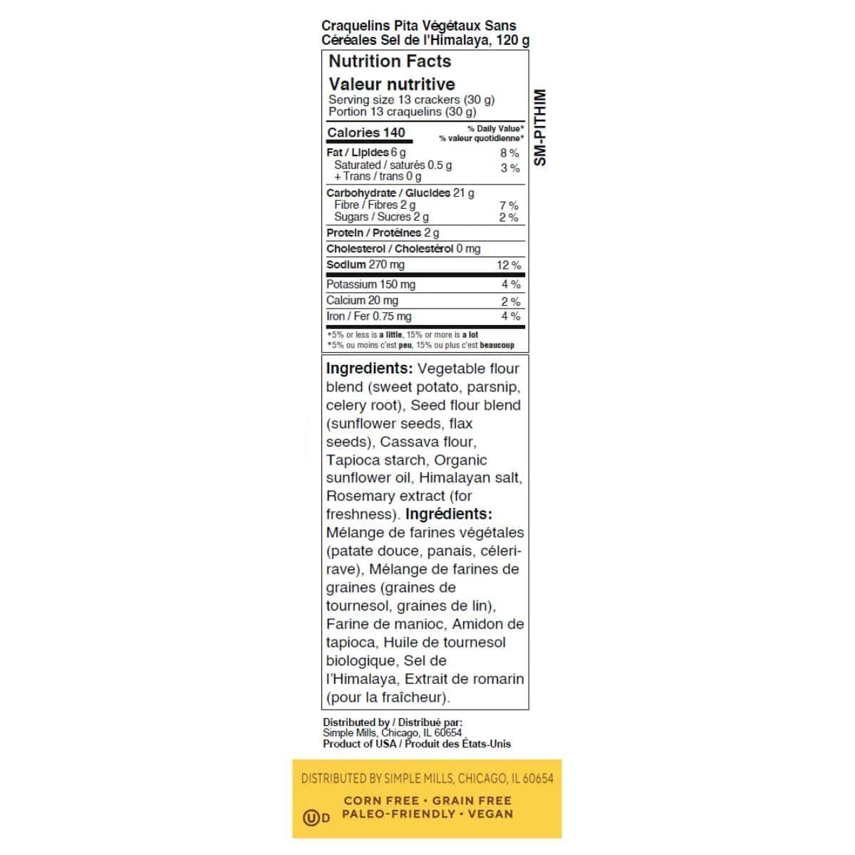 Vegetable Flour Blend (Sweet Potato, Parsnip, Celery Root), Seed Flour Blend (Sunflower Seeds, Flax Seeds), Cassava Flour, Tapioca Starch, Organic Sunflower Oil, Himalayan Salt, Rosemary Extract (for freshness).