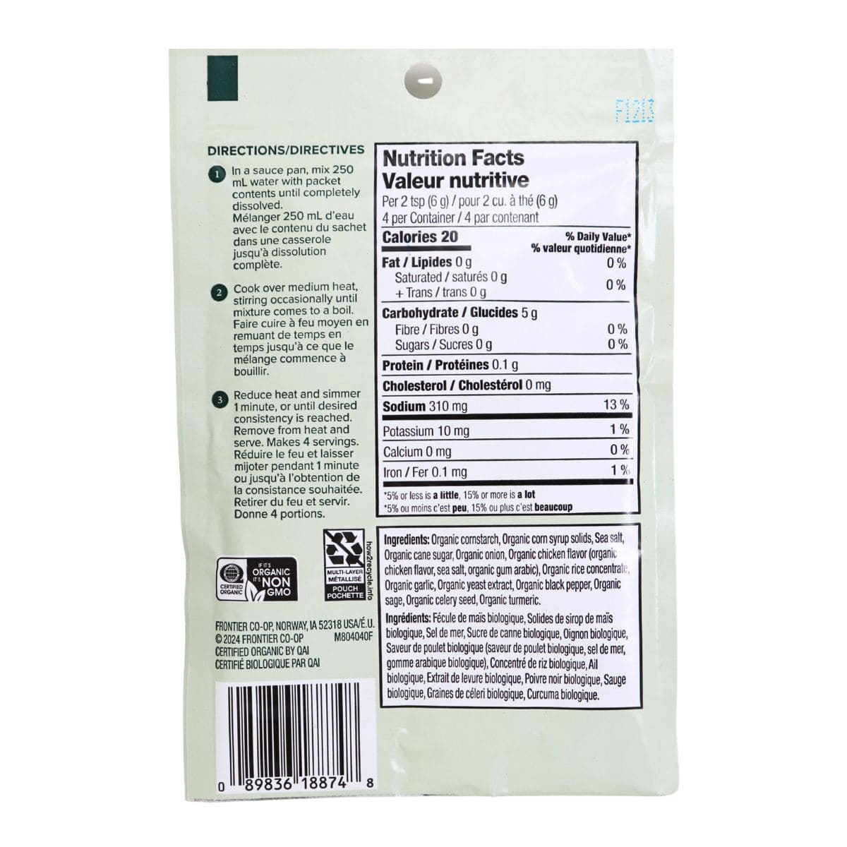 Organic cornstarch, Organic corn syrup solids, Sea salt, Organic cane sugar, Organic onion, Organic chicken flavour (organic chicken flavour, sea salt, organic gum arabic), Organic rice concentrate, Organic garlic, Organic yeast extract, Organic black pepper, Organic sage, Organic celery seed, Organic turmeric