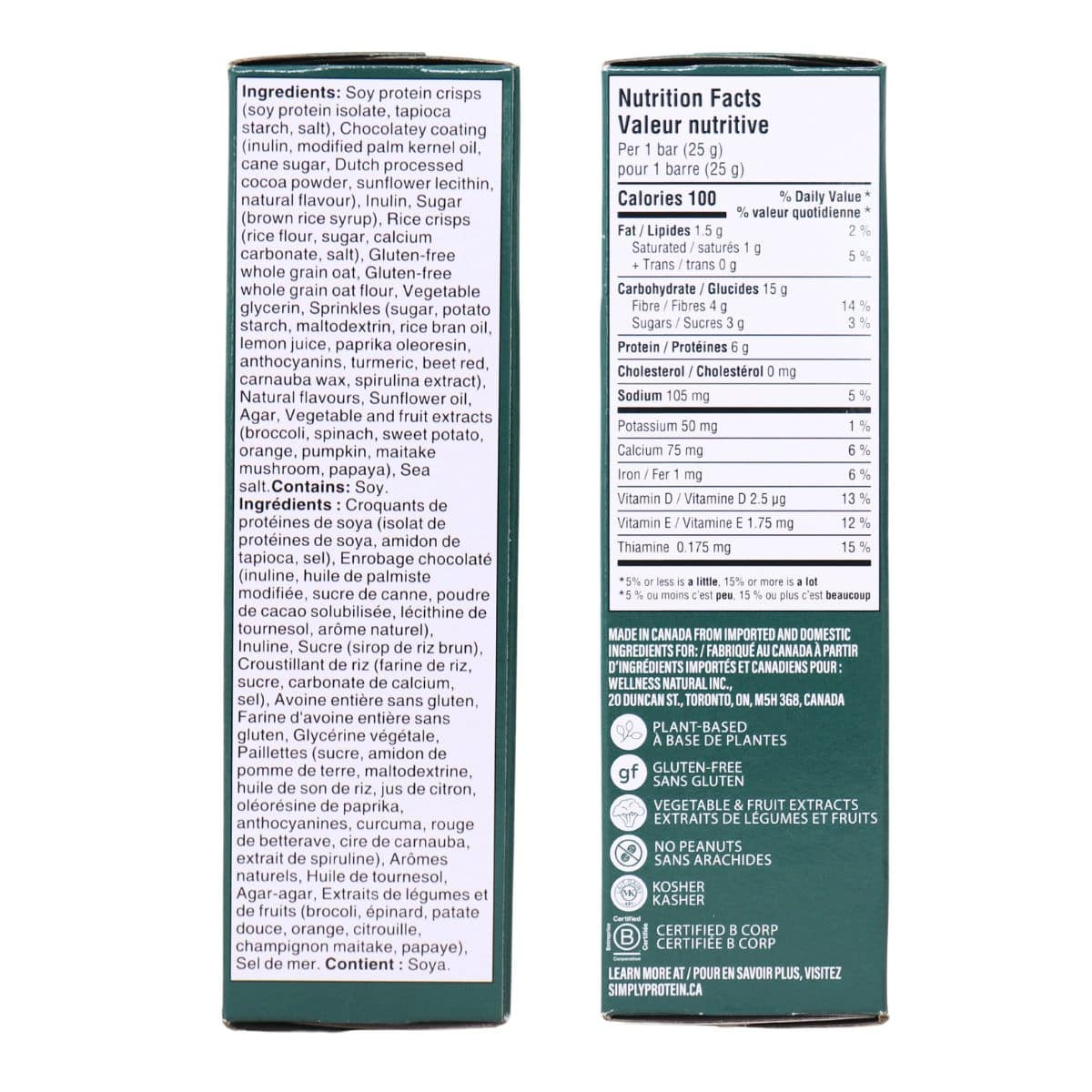 Soy protein crisps (soy protein isolate, tapioca starch, salt), Chocolatey coating (inulin, modified palm kernel oil, cane sugar, Dutch processed cocoa powder, sunflower lecithin, natural flavour), Inulin, Sugar (brown rice syrup), Rice crisps (rice flour, sugar, calcium carbonate, salt), Gluten free whole grain oat, Gluten free whole grain oat flour, Vegetable glycerin, Sprinkles (sugar, potato starch, maltodextrin, rice bran oil, lemon juice, paprika oleoresin, anthocyanins, turmeric, beet red, carnauba wax, spirulina extract), Natural flavours, Sunflower oil, Agar, Vegetable and fruit extracts (broccoli, spinach, sweet potato, orange, pumpkin, maitake mushroom, papaya), Sea salt