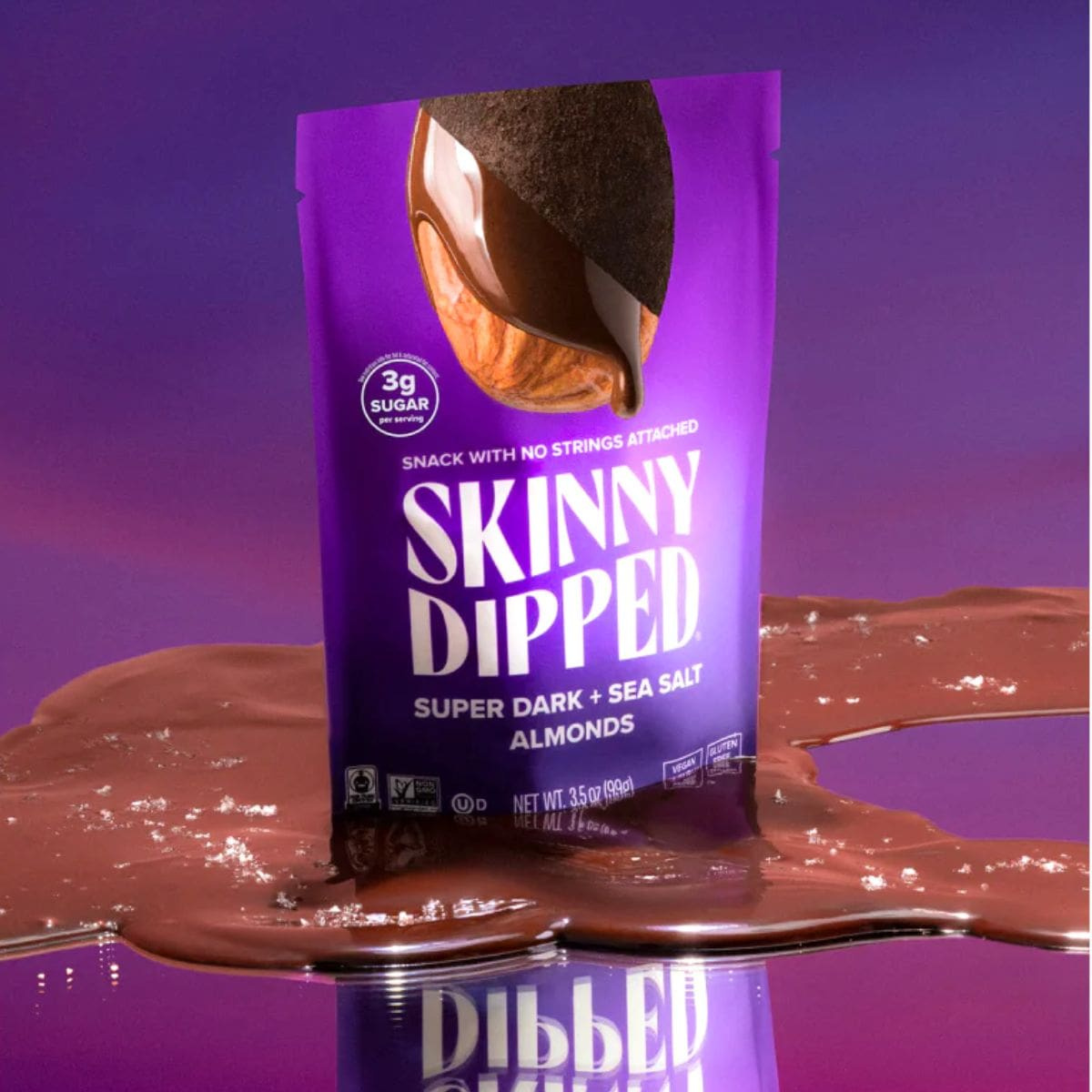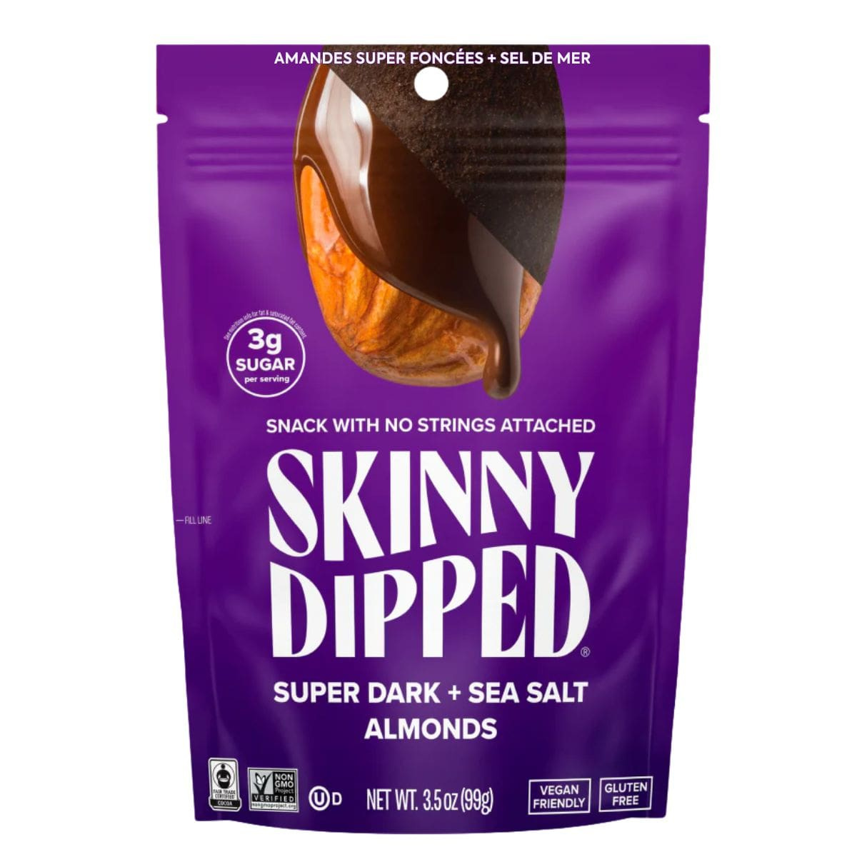 “Give Me More” is what you’ll say after one bite of Skinny Dipped Almonds Dipped in Super Dark Chocolate and Sea Salt. These vegan 73% cacao-covered almonds are as addictive as they sound. Each bite combines a crunchy inner texture with a perfectly sweetened chocolate shell and 4g of plant-based protein. Made with less sugar, ethically sourced chocolate, and no gluten or artificial ingredients, you’ll be proud to be a Skinny Dipper!