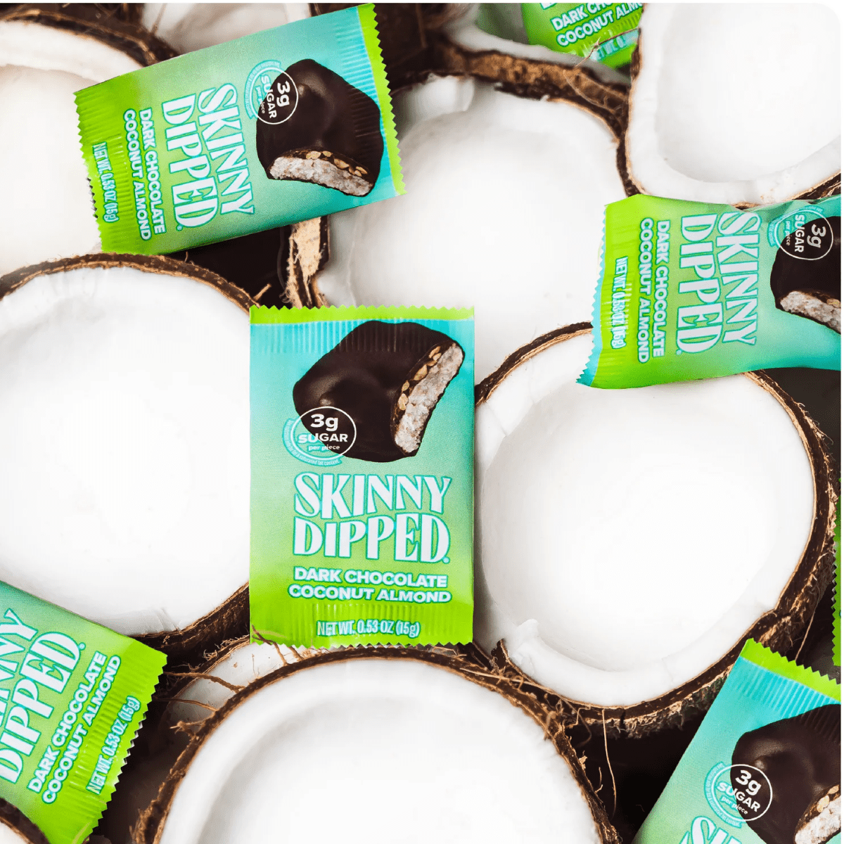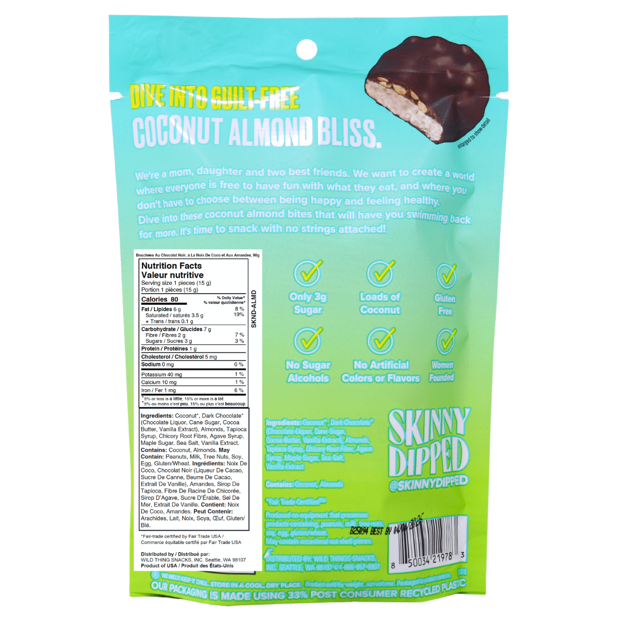 Skinny Dipped Dark Chocolate Coconut Almond Bites are the perfect sweet indulgence with less sugar. Each bite combines the perfect balance of crunchy almonds, sweet coconut, and dark chocolate. This low-sugar treat is keto-friendly and contains no sugar alcohols or artificial flavours. If you’re looking for a healthy snack that satisfies your chocolate cravings, Skinny Dipped delivers. Ideal for on-the-go snacking and mid-day pick-me-ups without the sugar crash.Â