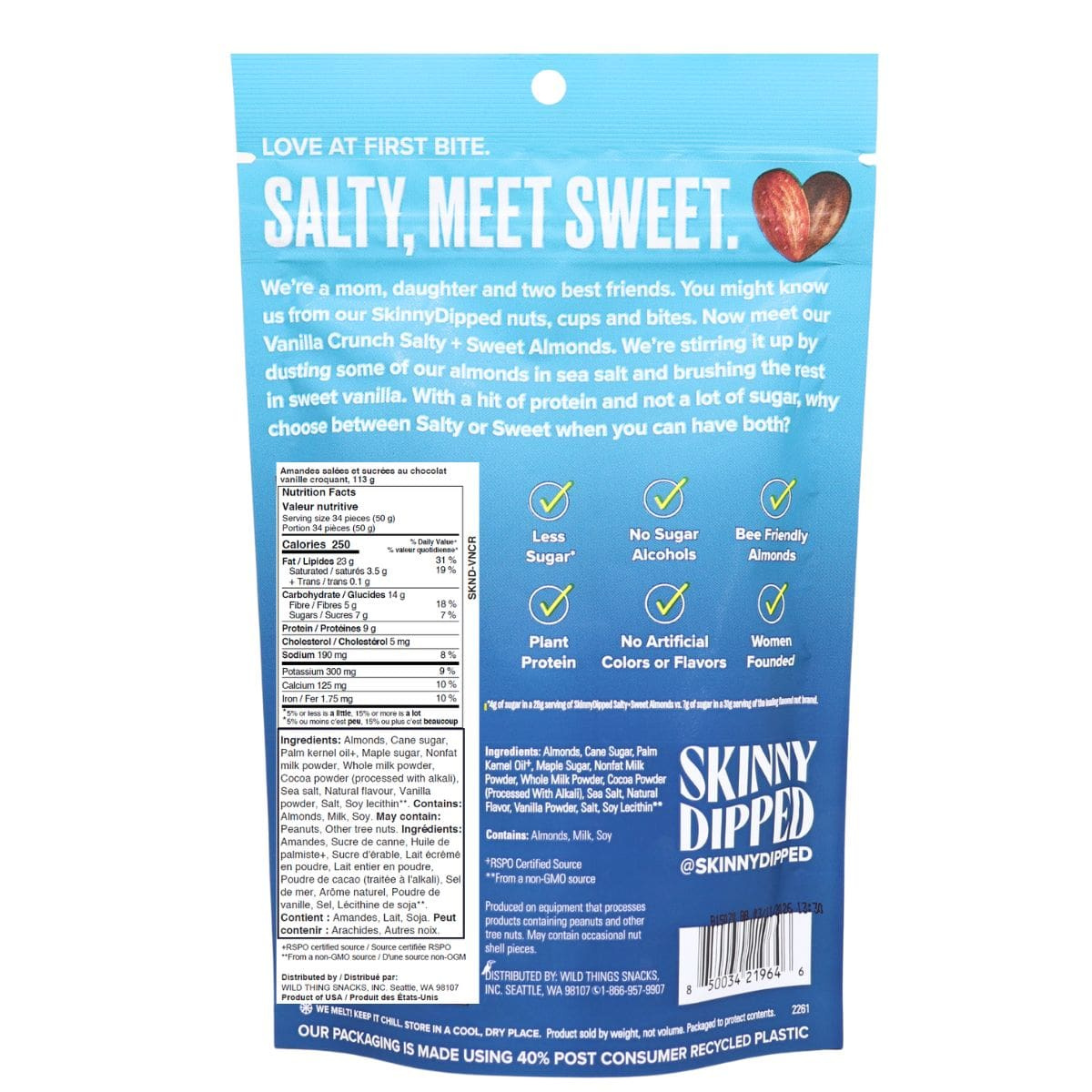 Can’t choose between sweet or salty? With Skinny Dipped’s almonds, you don’t have to! These Sweet + Salty Vanilla Crunch Almonds are the best of both worlds, with some dusted in a sprinkle of sea salt, and the rest in a sweet vanilla, every bite is equal parts addictively savoury and indulgently sweet. Lightly sweetened with unrefined maple sugar and a luscious yogourt coating, these almonds are like your favourite vanilla wafer, but crisper, crunchier, and way less sugar! Are you ready to take a dip, a Skinny Dipped that is?