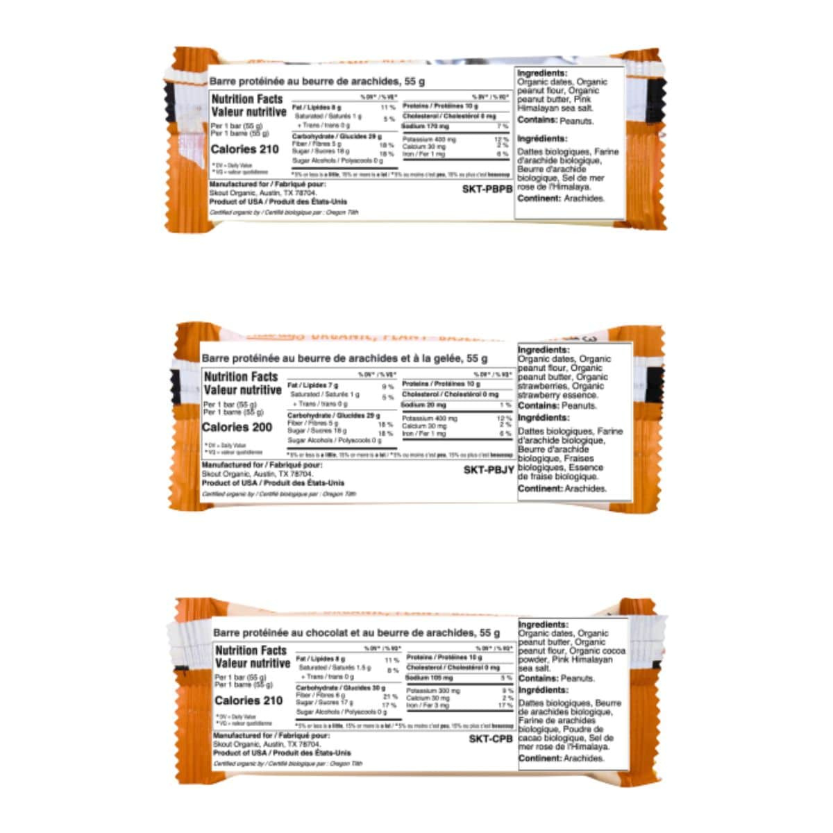 Snack smarter with the Skout Organic Protein Bar Variety 6-Pack, featuring three fan-favourite flavours: Peanut Butter, Peanut Butter & Jelly, and Chocolate Peanut Butter. Each bar is made with just a handful of simple, organic ingredients like dates, peanut butter, and peanut flour for clean, plant-based fuel that actually tastes amazing.