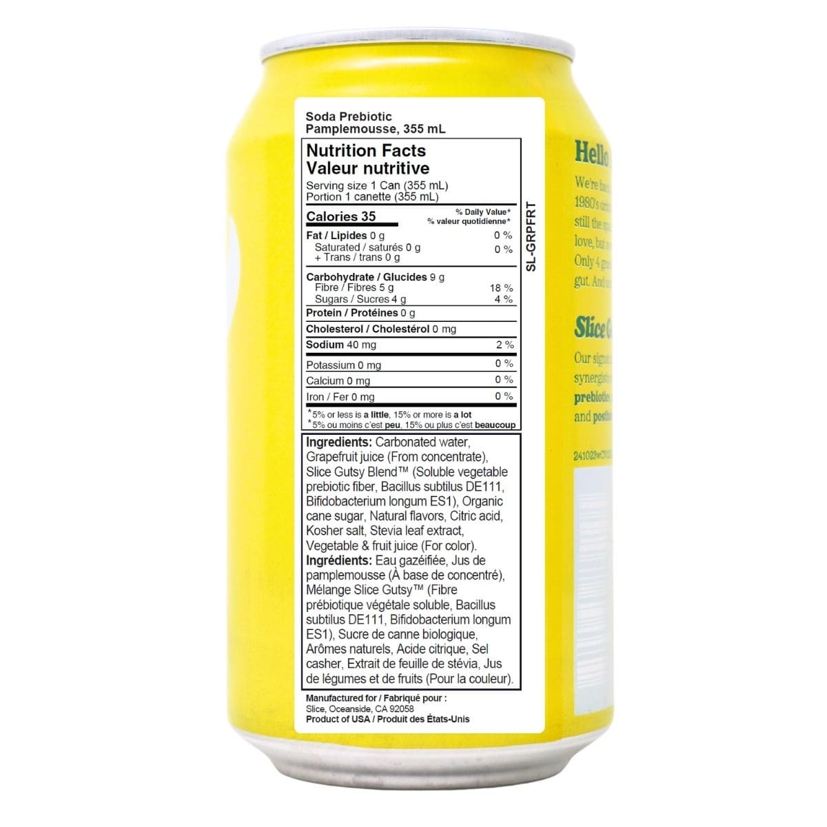 Carbonated water, Grapefruit juice (From concentrate), Slice Gutsy Blendâ„¢ (Soluble vegetable prebiotic fiber, Bacillus subtilus DE111, Bifidobacterium longum ES1), Organic cane sugar, Natural flavors, Citric acid, Kosher salt, Stevia leaf extract, Vegetable & fruit juice (For color).