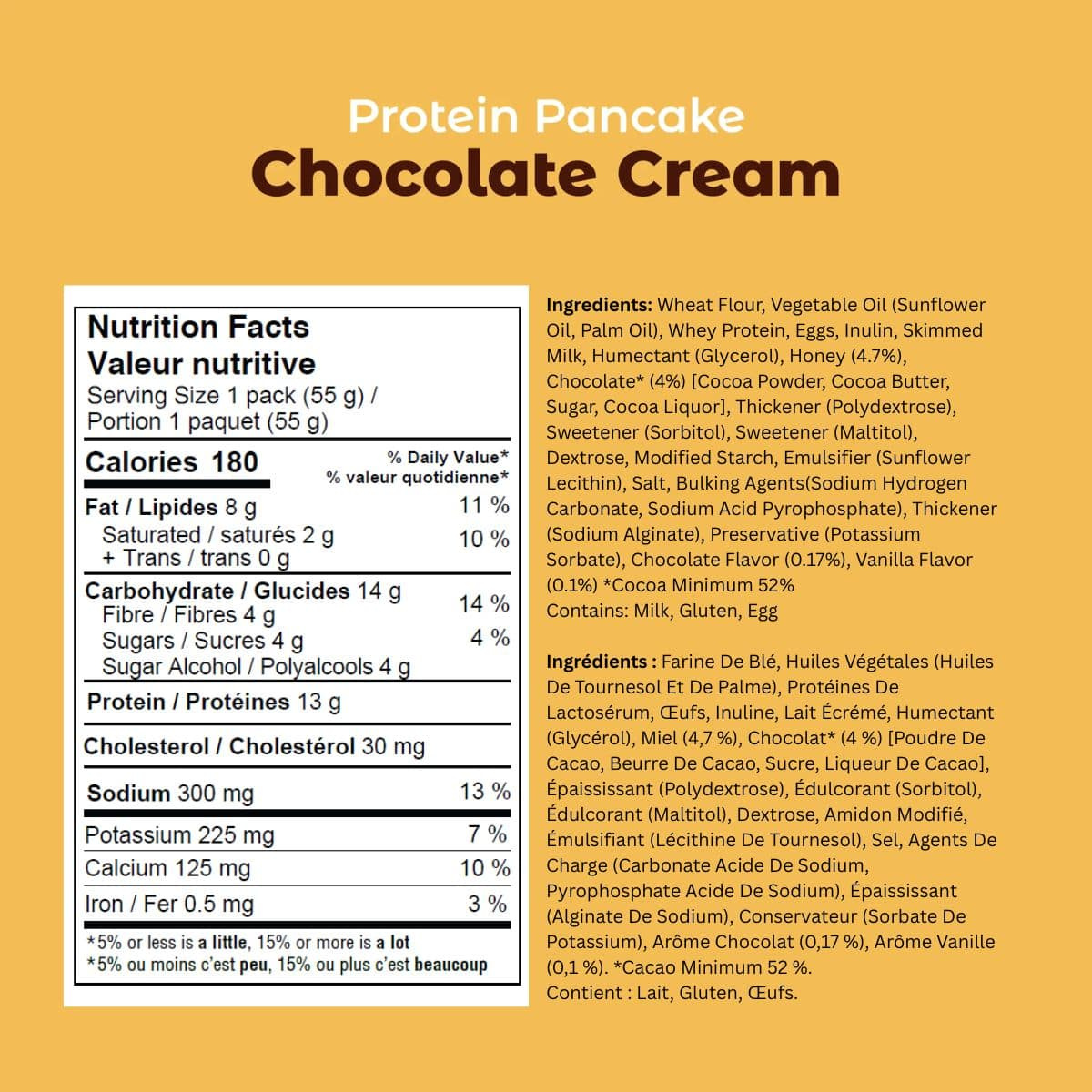 Wheat Flour, Vegetable Oil (Sunflower Oil, Palm Oil), Whey Protein, Eggs, Inulin, Skimmed Milk, Humectant (Glycerol), Honey (4.7%), Chocolate* (4%) [Cocoa Powder, Cocoa Butter, Sugar, Cocoa Liquor], Thickener (Polydextrose), Sweetener (Sorbitol), Sweetener (Maltitol), Dextrose, Modified Starch, Emulsifier (Sunflower Lecithin), Salt, Bulking Agents (Sodium Hydrogen Carbonate, Sodium Acid Pyrophosphate), Thickener (Sodium Alginate), Preservative (Potassium Sorbate), Chocolate Flavor (0.17%), Vanilla Flavor (0.1%) *Cocoa Minimum 52%