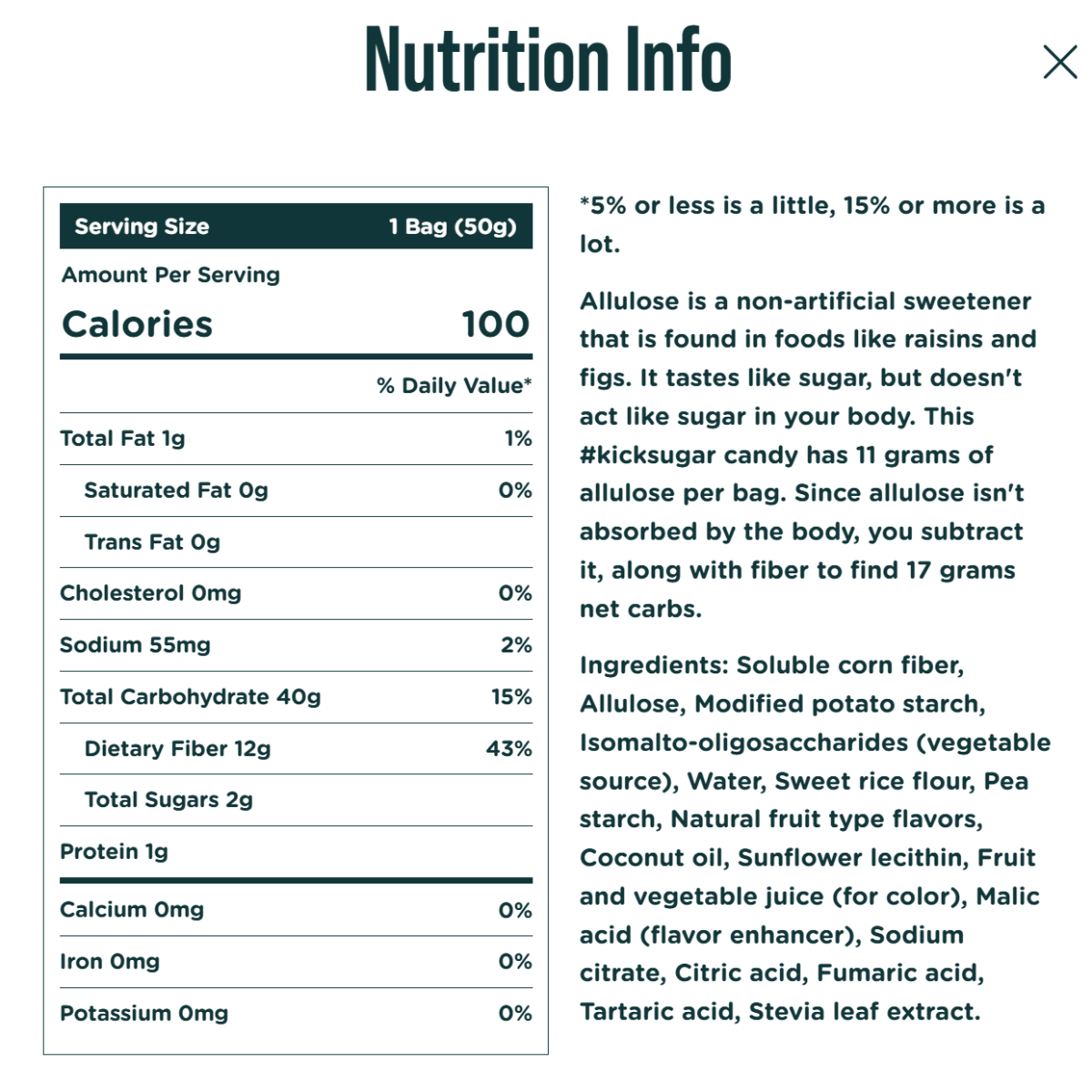 Soluble corn fiber, Allulose, Modified potato starch, Isomalto‑oligosaccharides (Vegetable source), Water, Sweet rice flour, Pea starch, Natural fruit type flavours, Coconut oil, Sunflower lecithin, Fruit and vegetable juice (For color), Malic acid (Flavour enhancer), Sodium citrate, Citric acid, Fumaric acid, Tartaric acid, Stevia leaf extract.