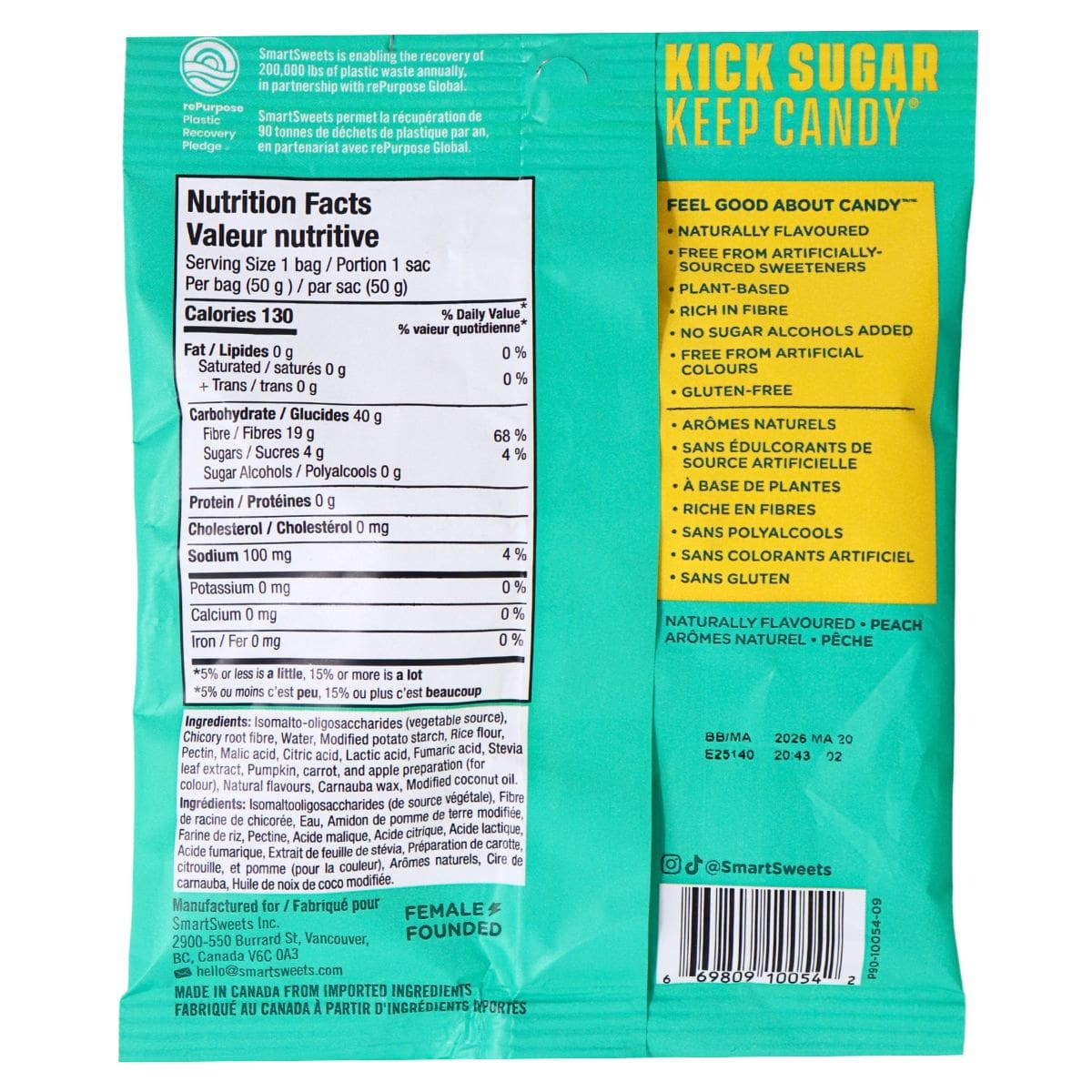 SmartSweets plant-based Peach Rings are destined to be your new obsession! It's the first delicious candy peach ring without the sugar. Free from gluten, dairy, soy, peanuts, tree nuts, sugar alcohols and artificial sweeteners. Completely, vegan, and naturally flavoured. It's a candy worth having!