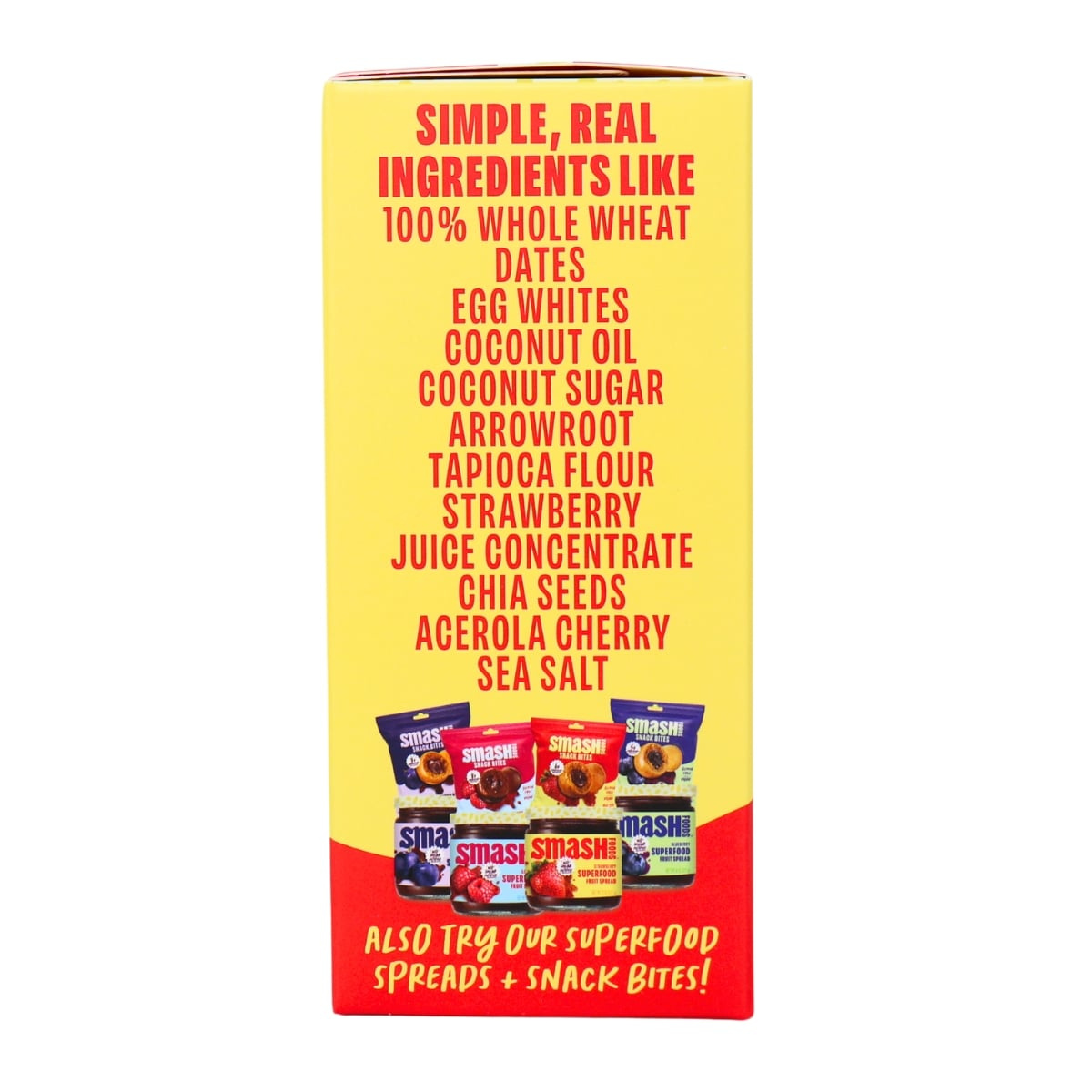100% Whole wheat flour, Dates, Coconut oil, Tapioca flour, Coconut sugar, Date powder, Arrowroot, Strawberry juice concentrate, Egg whites, Baking powder, Chia seeds, Apple cider vinegar, Sea salt, Vanilla powder, Fruit pectin, Acerola cherry powder, Natural flavour, Rosemary extract