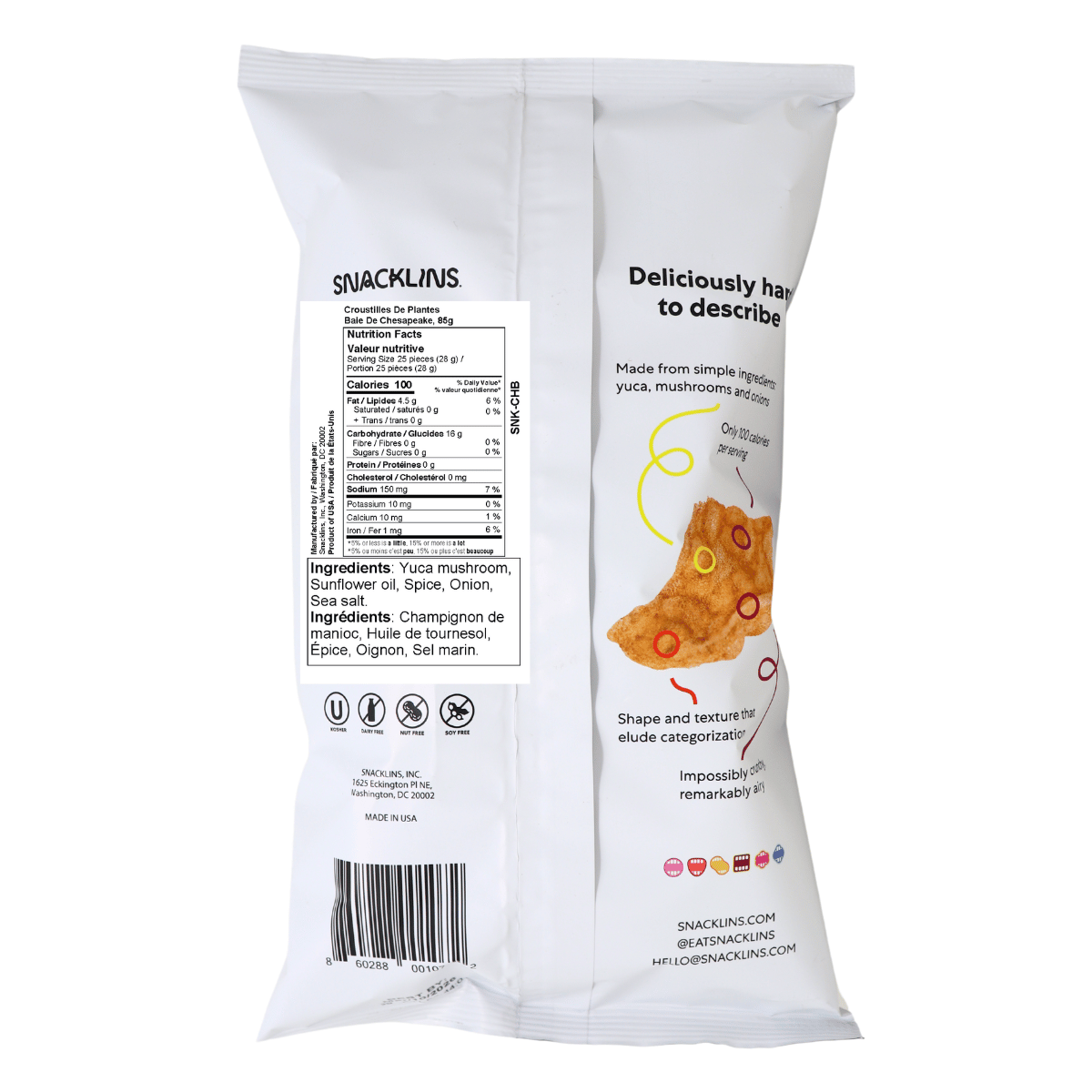 Snacklins Chesapeake Bay Plant Crisps bring you a classic Mid-Atlantic flavour straight to your door. This gluten-free snack crisp is packed with bold flavours and a light airy crunch, without the compromise on your health goals. These crab spice flavoured plant crisps are made from yuca, mushrooms, and onions, and seasoned with a bold blend of bay seasonings for a regional favourite, now worldwide! A real vegan pork rind made from veggies, with all that salty crunch you’re used to from homemade pork rinds.