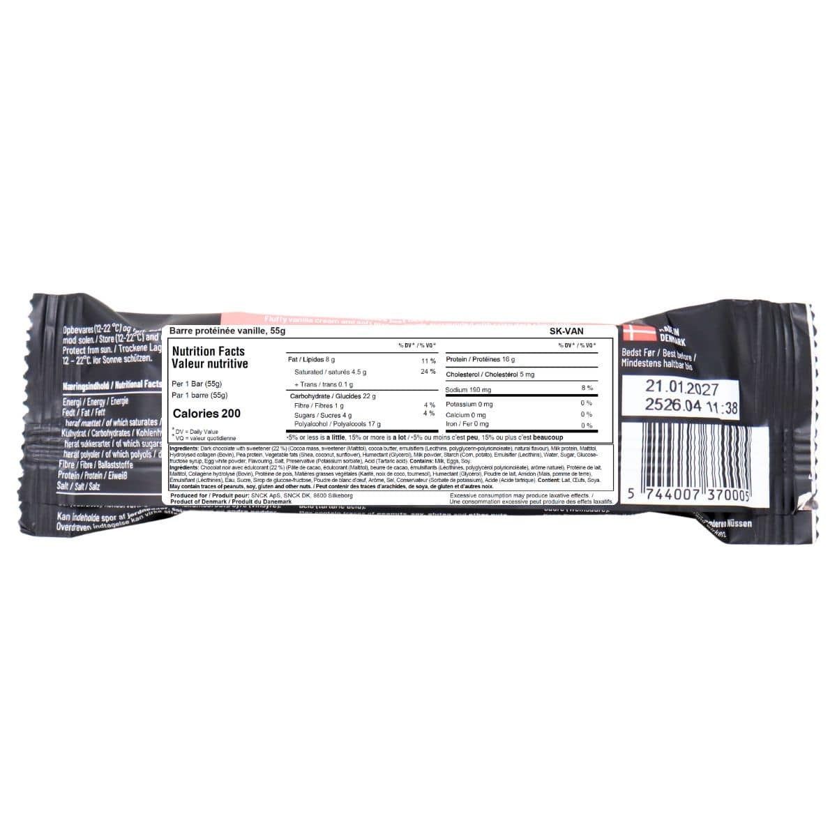 Dark chocolate with sweetener (22 %) (Cocoa mass, sweetener (Maltitol), cocoa butter, emulsifiers (Lecithins, polyglycerin-polyricinoleate), natural flavour), Milk protein, Maltitol, Hydrolysed collagen (Bovin), Pea protein, Vegetable fats (Shea, coconut, sunflower), Humectant (Glycerol), Milk powder, Starch (Corn, potato), Emulsifier (Lecithins), Water, Sugar, Glucose-fructose syrup, Egg white powder, Flavouring, Salt, Preservative (Potassium sorbate), Acid (Tartaric acid).