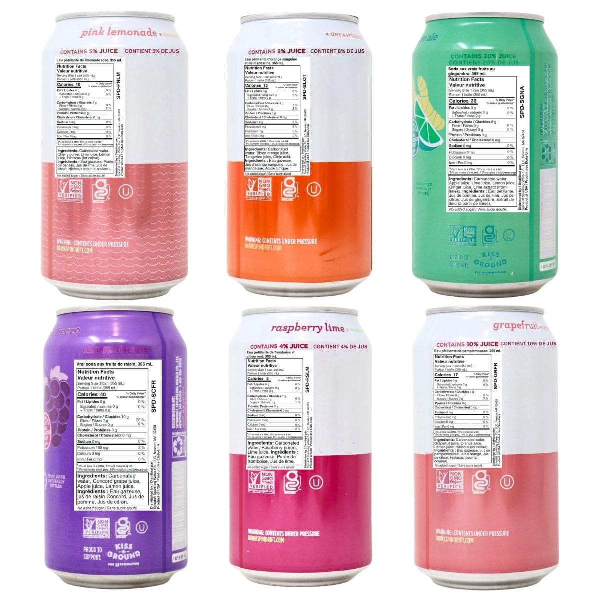 1 can each of Sparkling Water Blood Orange Tangerine, Sparkling Water Raspberry Lime, Sparkling Water Pink Lemonade, Sparkling Water Grapefruit, Soda Ginger Ale, and Soda Concord Freeze (all 355 mL each).