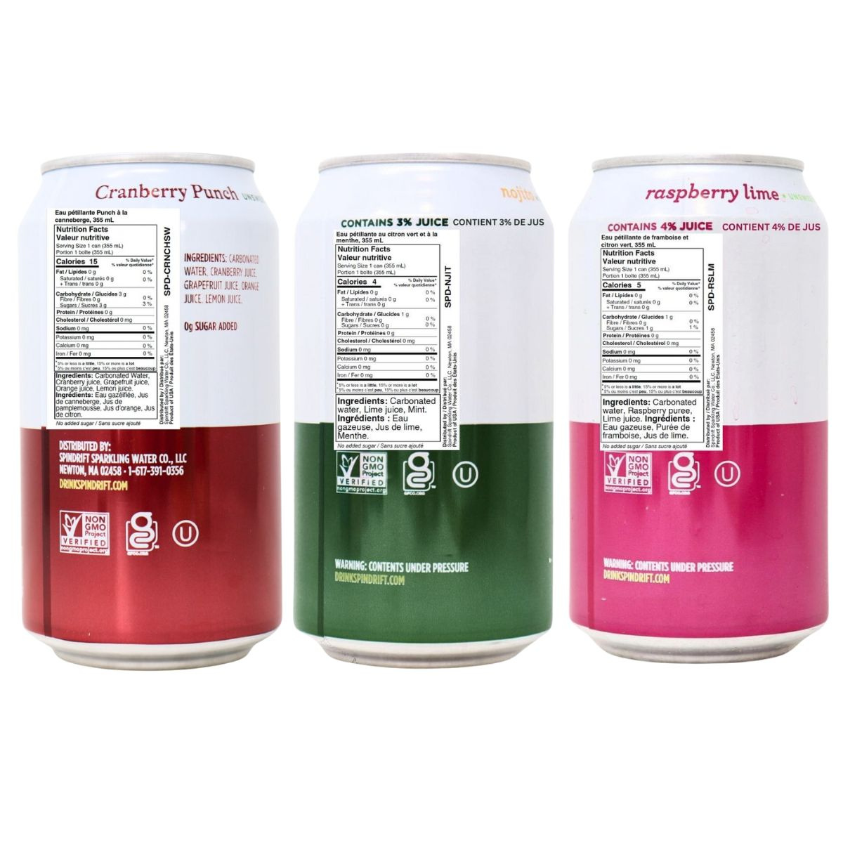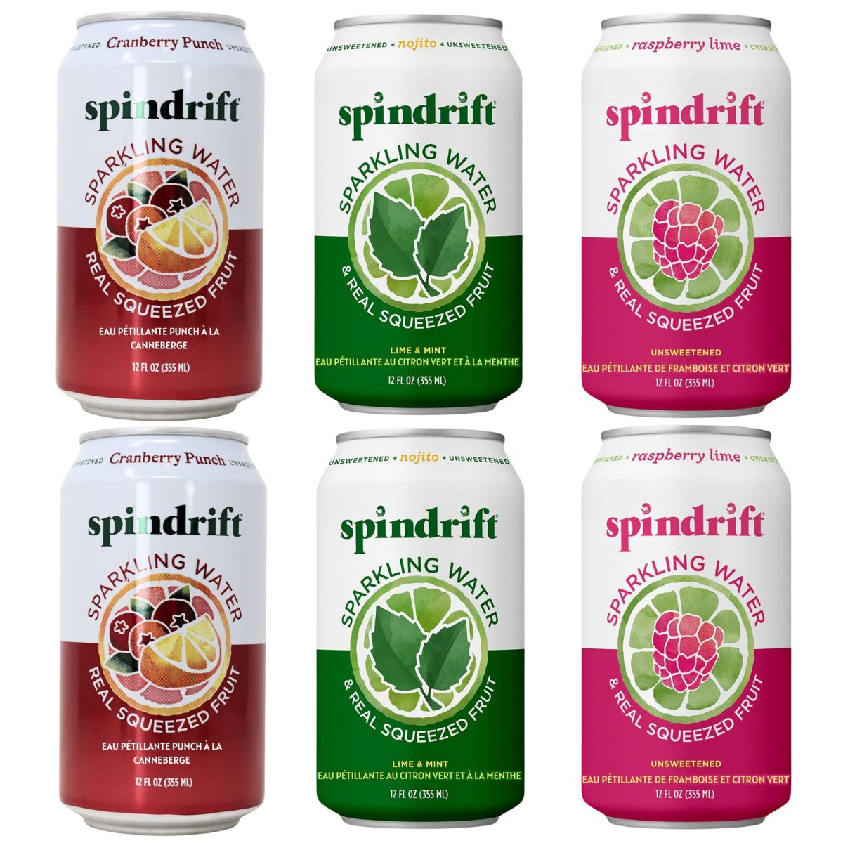 2 cans each of Spindrift Cranberry Punch, Spindrift Sparkling Water With Real Fruit Nojito, and Spindrift Sparkling Water With Real Fruit Raspberry Lime (all 355 mL each)
