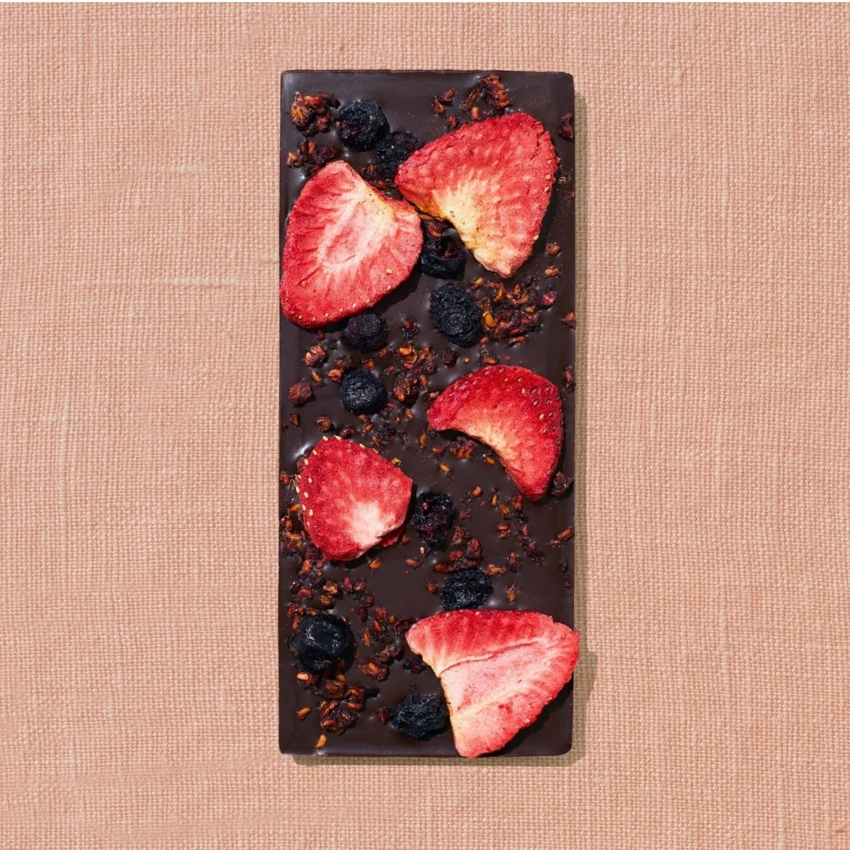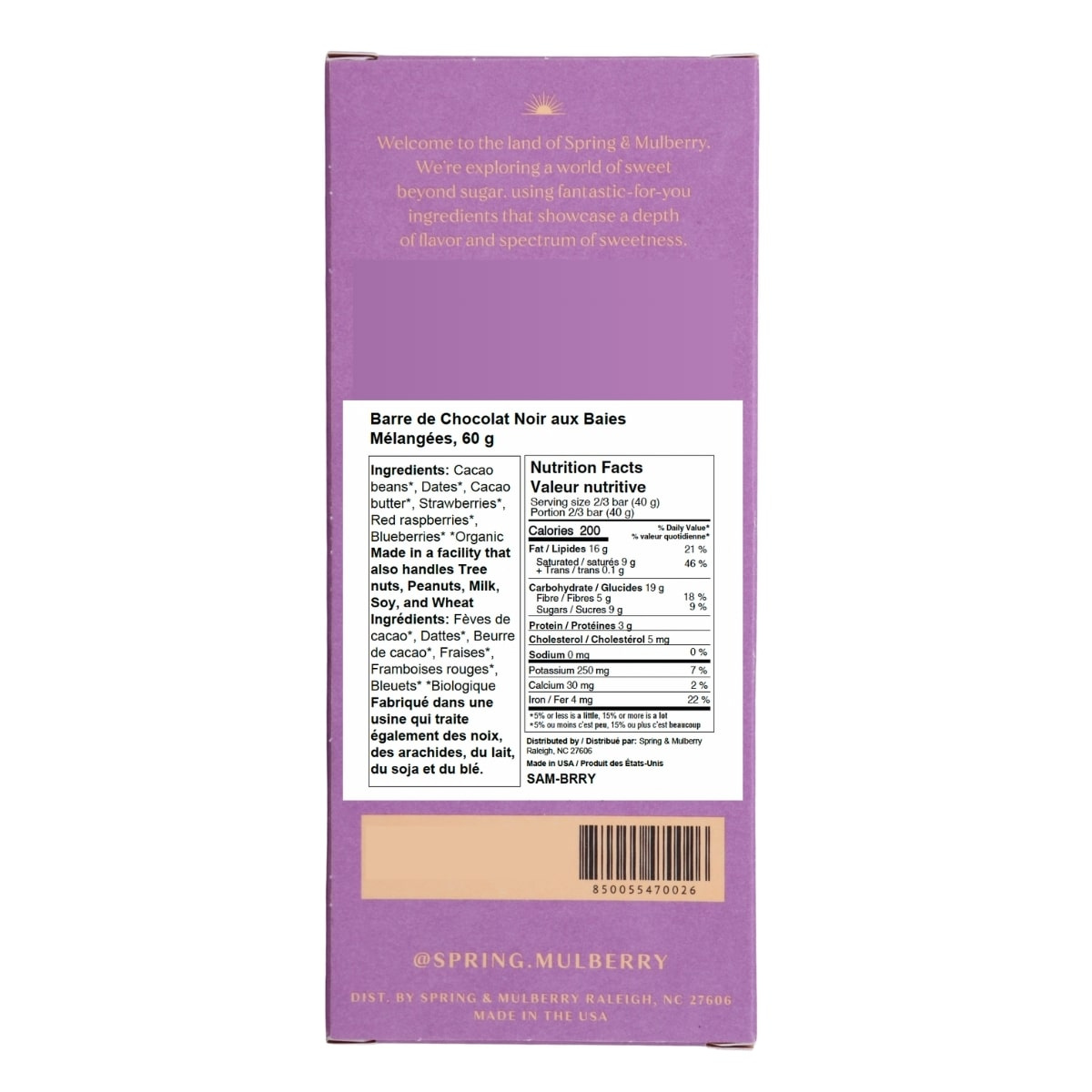 Spring & Mulberry Dark Chocolate Bar Mixed Berry blends rich, 72% cacao dark chocolate with a medley of real organic berries for a decadent yet wholesome treat. Bursting with the fresh sweetness and tartness of strawberries, raspberries, and blueberries, this chocolate bar delivers a satisfying, fruity crunch in every bite. Made with simple, organic ingredients and naturally sweetened with dates instead of refined sugars, it’s the perfect indulgence for chocolate and berry lovers alike.