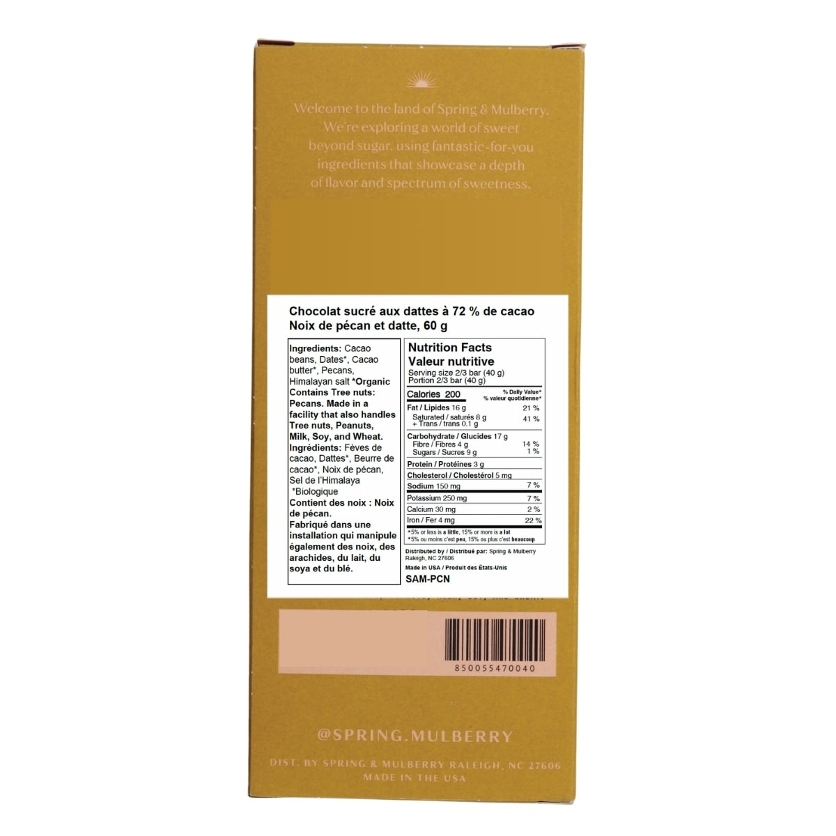 Indulge in the natural sweetness of dates with Spring & Mulberry 72% Cacao Date-Sweetened Chocolate Pecan Date. This elevated chocolate bar blends smooth, rich 72% cacao with crunchy toasted pecans and chewy Medjool dates for a perfectly balanced, indulgent bite, all without refined sugar.