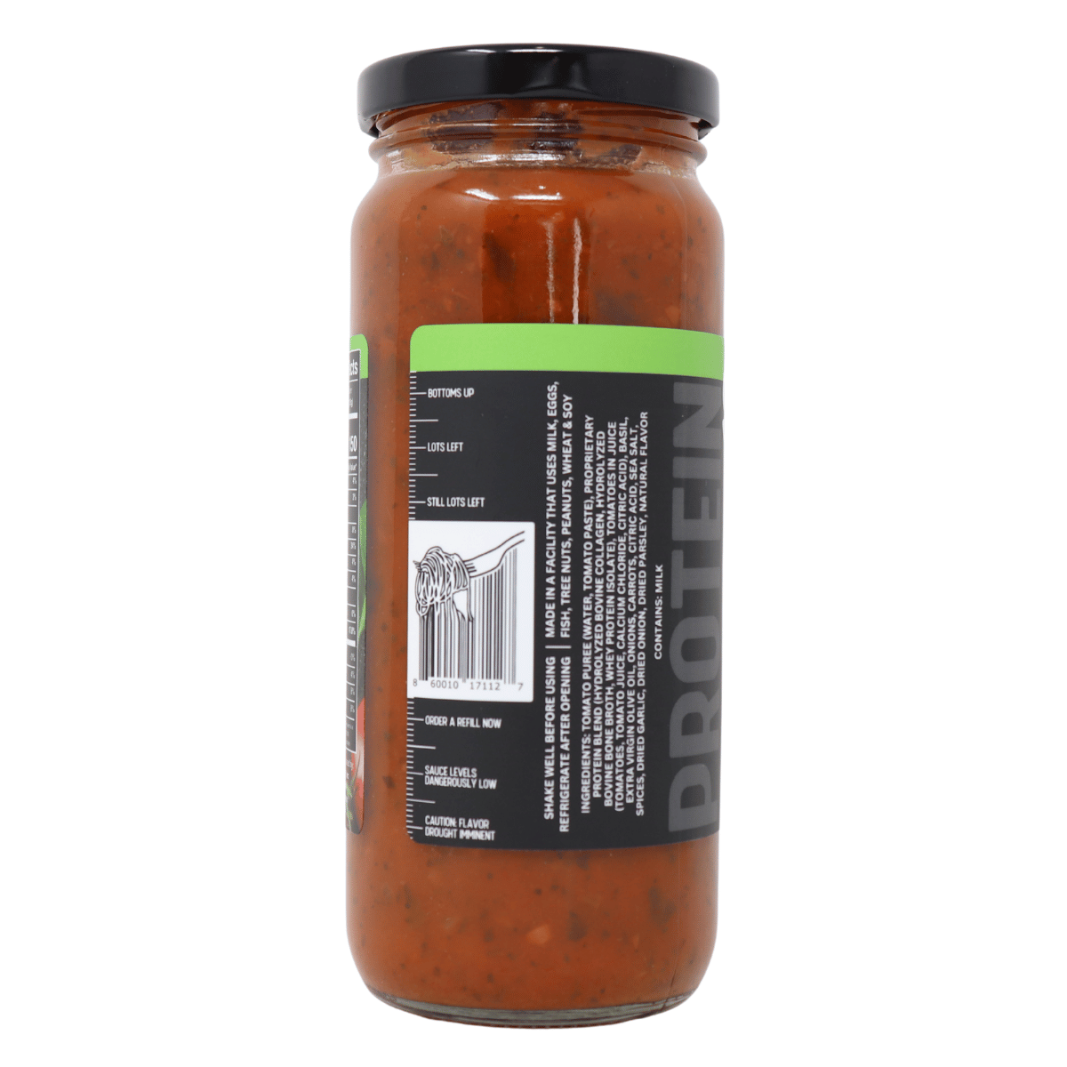 Tomato purée (Water, tomato paste), Proprietary protein blend (Hydrolyzed bovine collagen, hydrolyzed bovine bone broth, whey protein isolate), Tomatoes in juice (Tomatoes, tomato juice, calcium chloride, citric acid), Basil, Extra virgin olive oil, Onions, Carrots, Citric acid, Sea salt, Spices, Dried garlic, Dried onion, Dried parsley, Natural flavor.