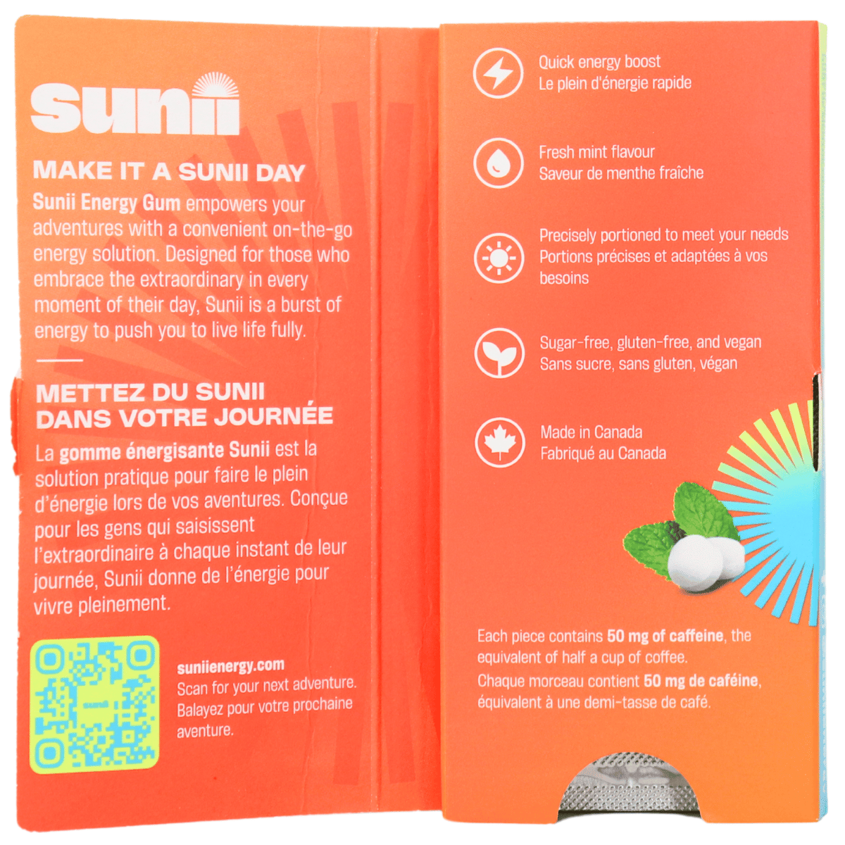Sunii Fresh Mint Energy Gum gives you 50mg of caffeine in every chew, plus L-theanine (about as much as half a cup of coffee!). That means a quick lift without the crash, a fresh taste without the sugar, and a gum you can actually feel working.