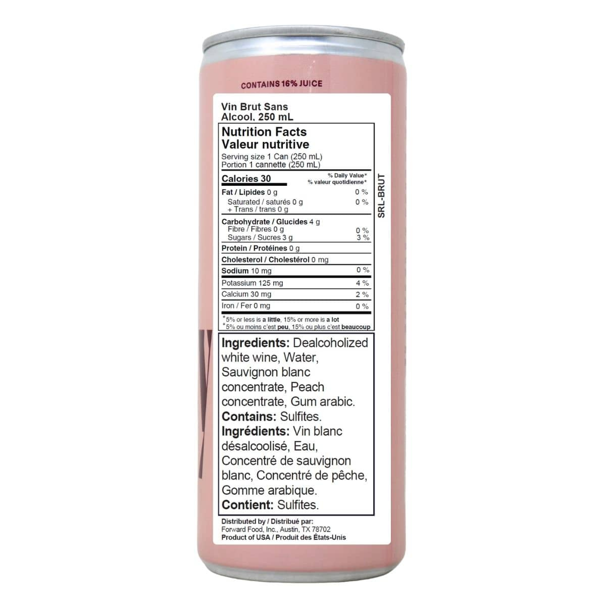 Dealcoholized rosé wine, Water, Peach concentrate, Sauvignon blanc concentrate, Gum arabic, Sulfites (Preservative).