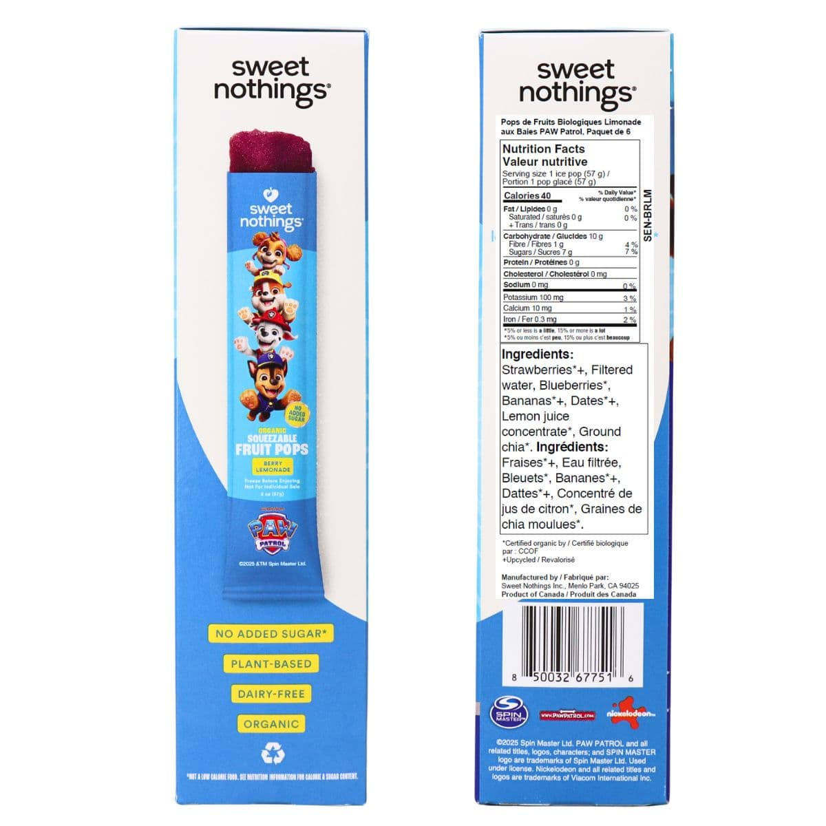 Sweet Nothings Organic Berry Lemonade PAW Patrol Squeezable Fruit Pops are a naturally sweet, plant-based frozen snack packed with real fruit and no refined sugar. Each pouch blends organic berries, lemon, bananas, dates, and chia seeds for a tangy-sweet frozen dessert kids love, and ingredients parents trust.