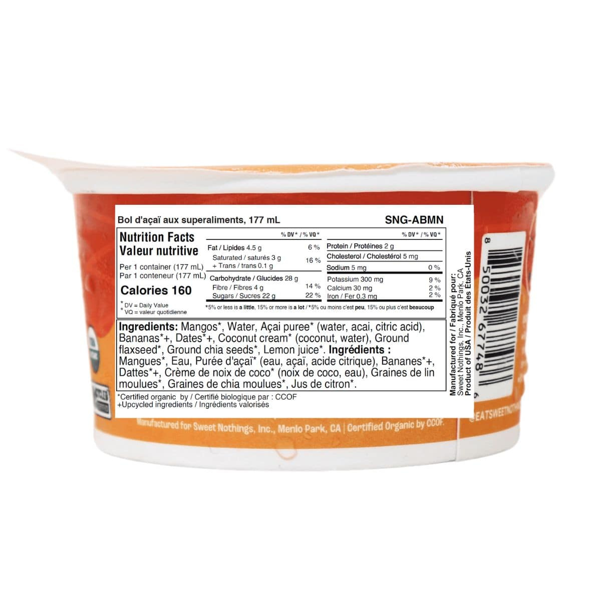 Mango lovers, your spoon has a new soulmate! Sweet Nothings Mango Açaí Bowl is a tropical twist on your classic smoothie bowl. Also minus the blender, mess and early morning prep. Just grab a spoon, peel the lid and dig into sunshine.