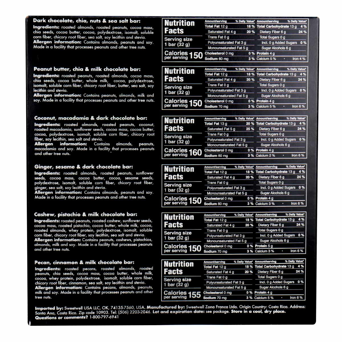 Dark Chocolate Chia, Nuts & Sea Salt: Roasted Almonds, Roasted Peanuts, cocoa mass, chia seeds, cocoa butter, cocoa, polydextrose, isomalt, soluble corn fibre, chicory root fibre, sea salt, soy lecithin and stevia.