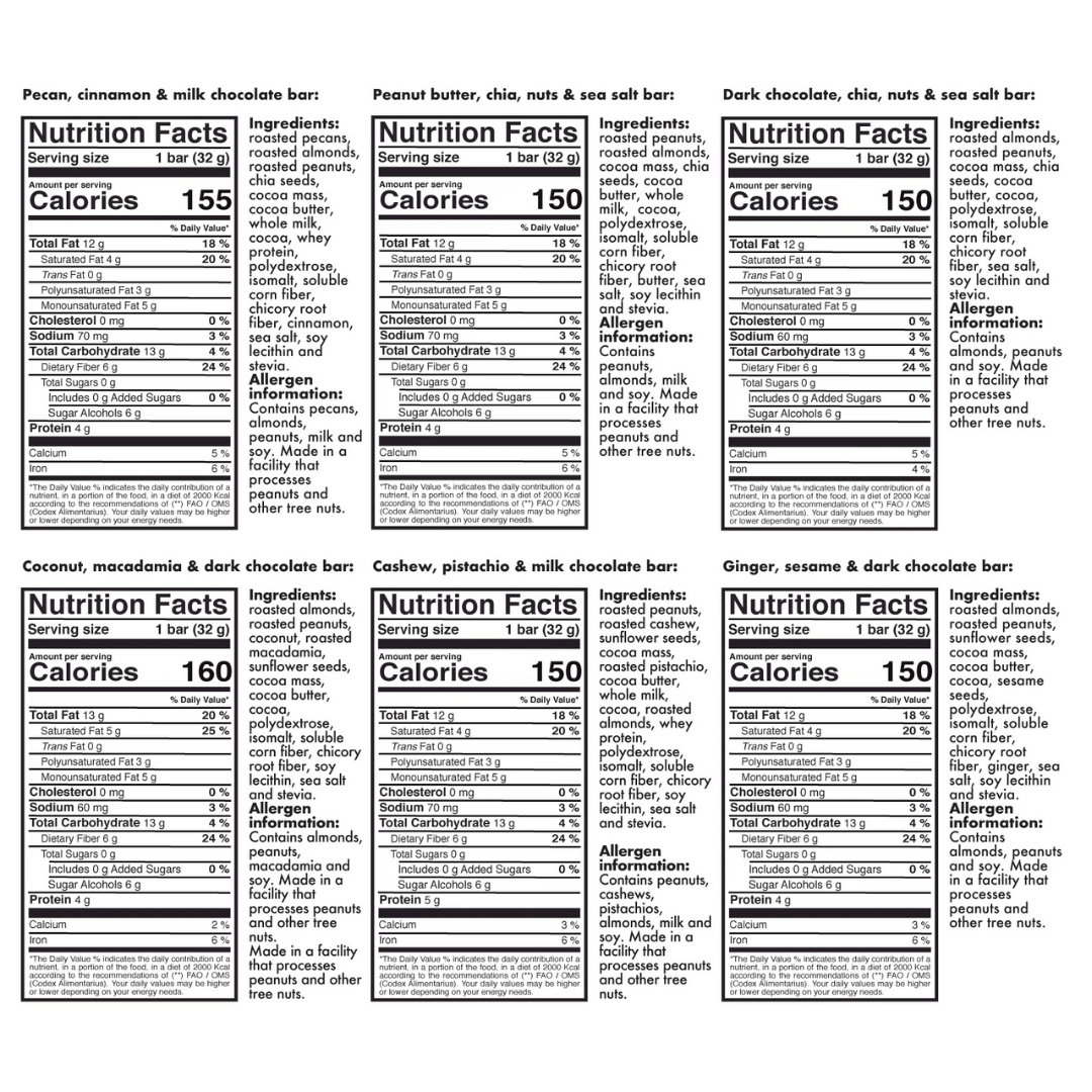 Pecan, Cinnamon & Milk Chocolate: Roasted Pecans, Roasted Almonds, Roasted Peanuts, Chia Seeds, Cocoa Mass, Cocoa Butter, Cocoa, Whole Milk, Cocoa, Whey Protein, Polydextrose, Isomalt, Soluble Corn Fibre, Chicory Root Fibre, Cinnamon, Sea Salt, Soy Lecithin and Stevia.