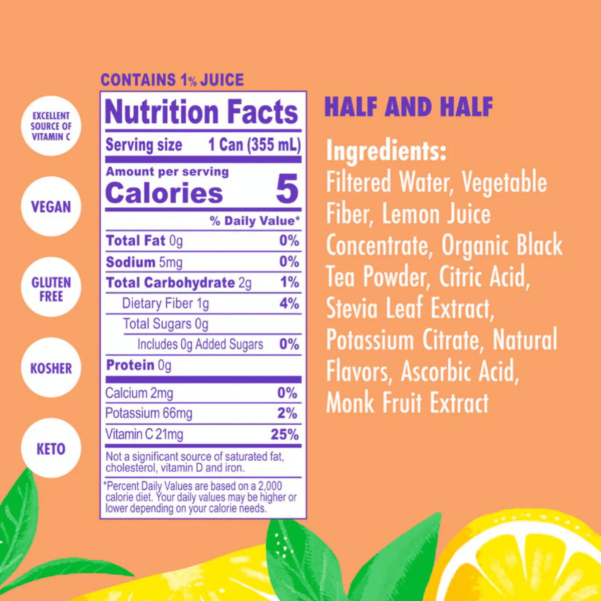 This zero sugar iced tea blends brewed black and green teas to create a well-balanced drink with gentle caffeine and full flavour. There are no artificial sweeteners. No artificial colours. No refined sugars. Just a simple ingredients list that keeps things clean. Whether you're after a classic tea flavour or want a drink that straddles iced tea and lemonade, this Half & Half brings the best of both.