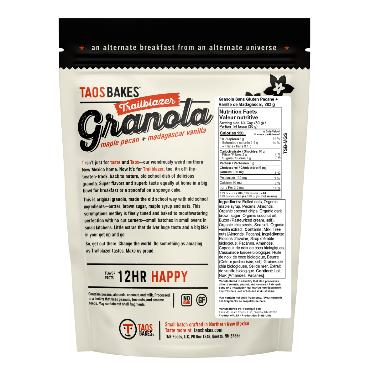 Smooth vanilla and buttery pecans turn this small-batch granola into a fragrant, toasty blend you’ll want in every morning bowl. Taos Bakes Maple Pecan + Madagascar Vanilla Granola combines roasted pecans, golden oats, pure maple syrup, and real Madagascar vanilla for clusters that taste rich and aromatic in every bite.Â