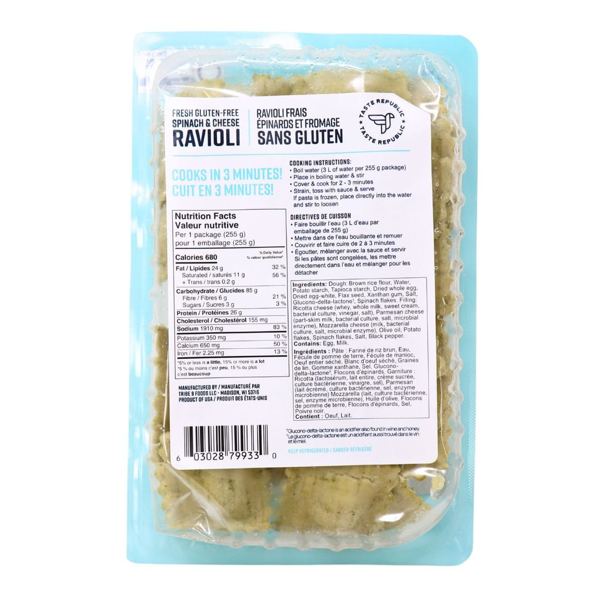 Dough: Brown rice flour, Water, Potato starch, Tapioca starch, Dried whole egg, Dried egg-white, Flax seed, Xanthan gum, Salt, Glucono-delta-lactone†, Spinach flakes. Filling: Ricotta cheese (Whey, whole milk, sweet cream, starter culture, vinegar, salt), Parmesan cheese (Part-skim milk, bacterial culture, salt, microbial enzyme), Mozzarella cheese (Milk, bacterial culture, salt, microbial enzyme), Olive oil, Potato flakes, Spinach flakes, Salt, Black pepper.
